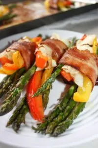 - Place the wraps onto the baking sheet lined with tinfoil and place in the preheated 400F oven for 20 – 25 minutes or until asparagus and bacon are cooked.