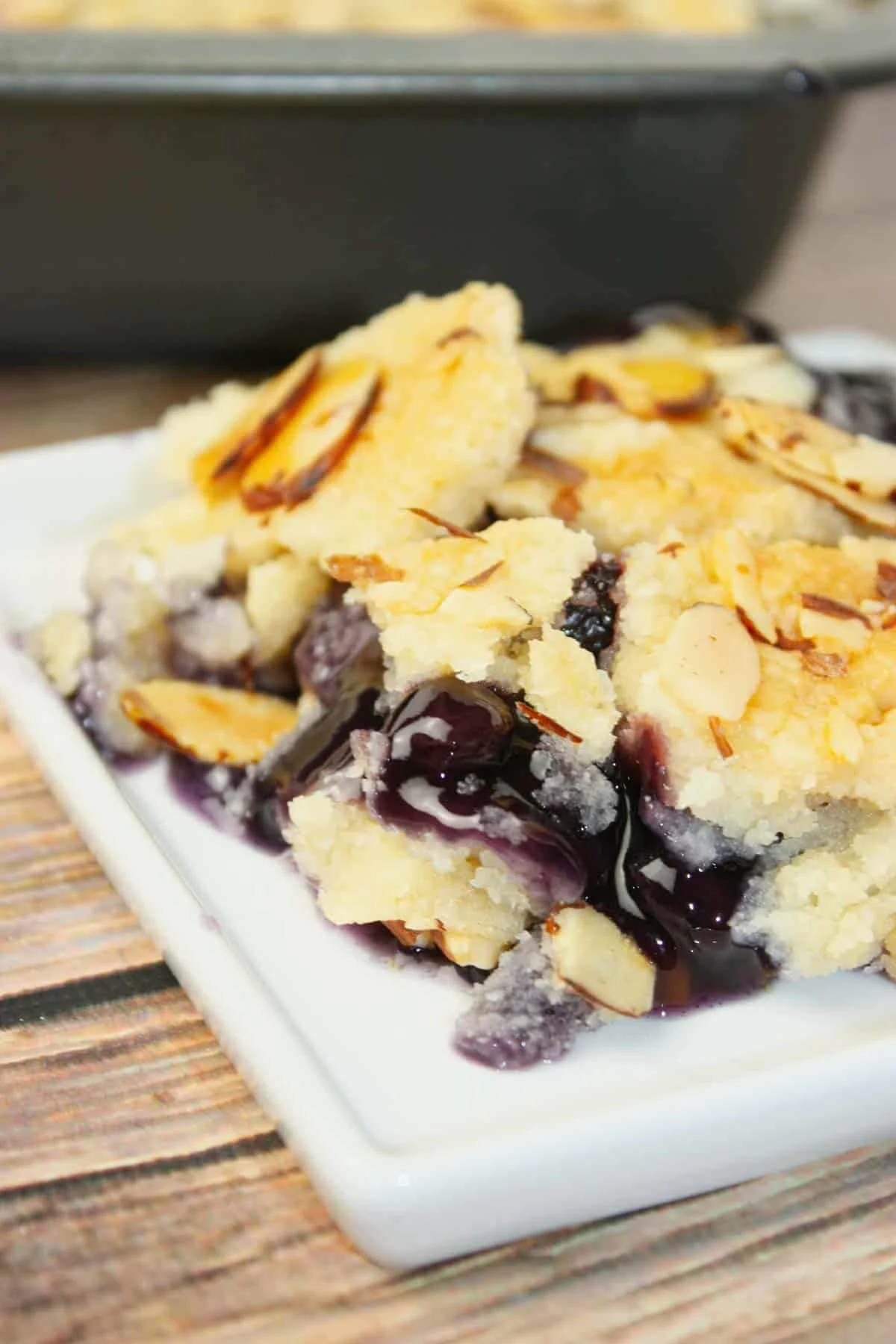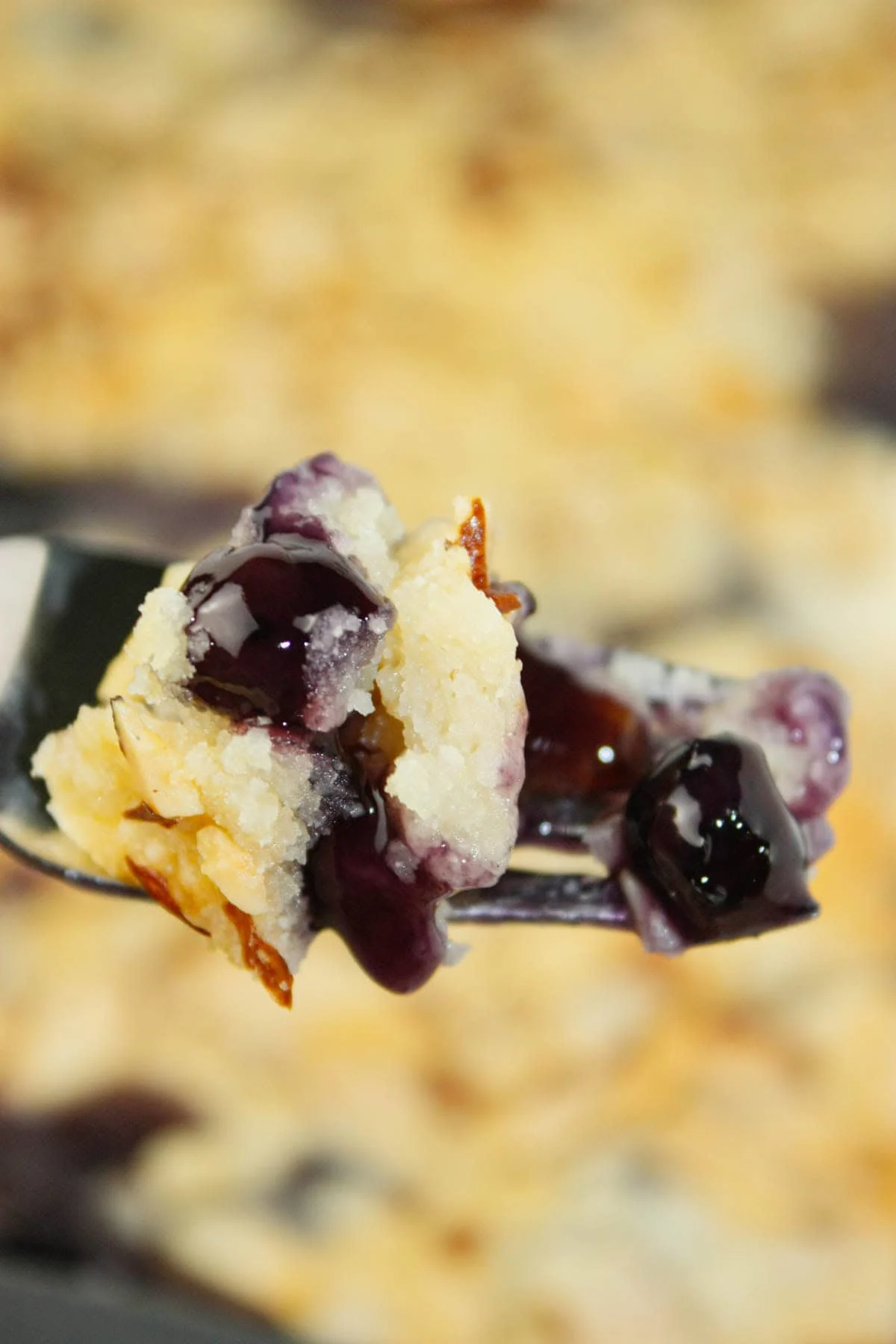 Blueberry Peach Dump Cake is bursting with juicy fruit flavour in every bite. Sweet peaches and plump blueberries mingle together under a golden, buttery cake topping.