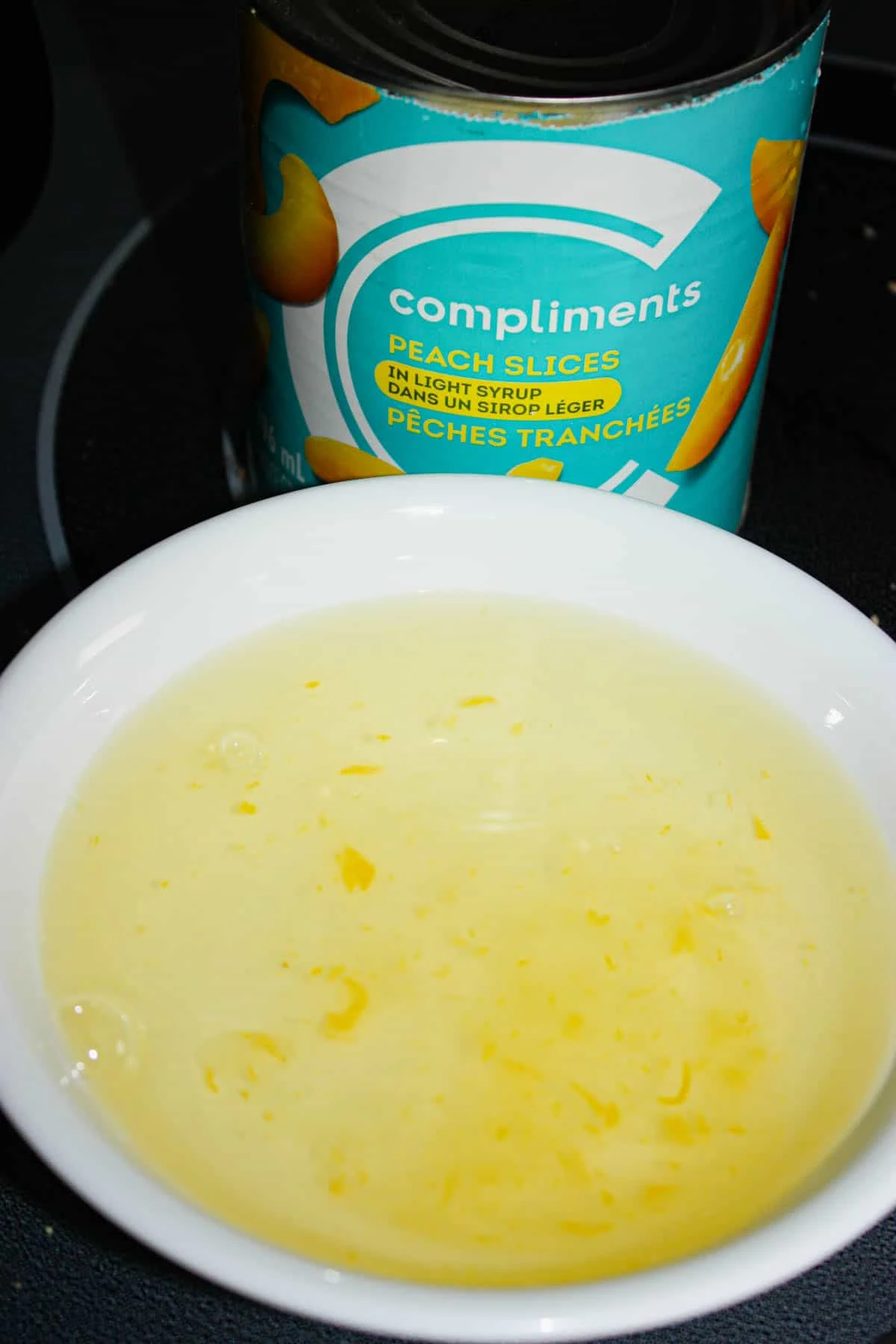 - Spread the blueberry pie filling and 1/2 cup of the reserved peach syrup.