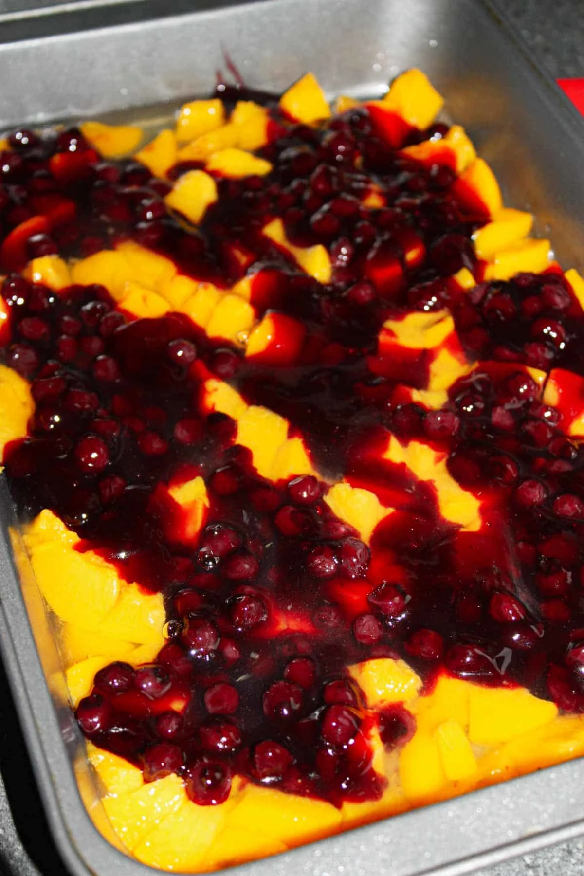 Then I spread the blueberry pie filling on top of the peaches. Also pour on a bit of the reserved peach syrup.