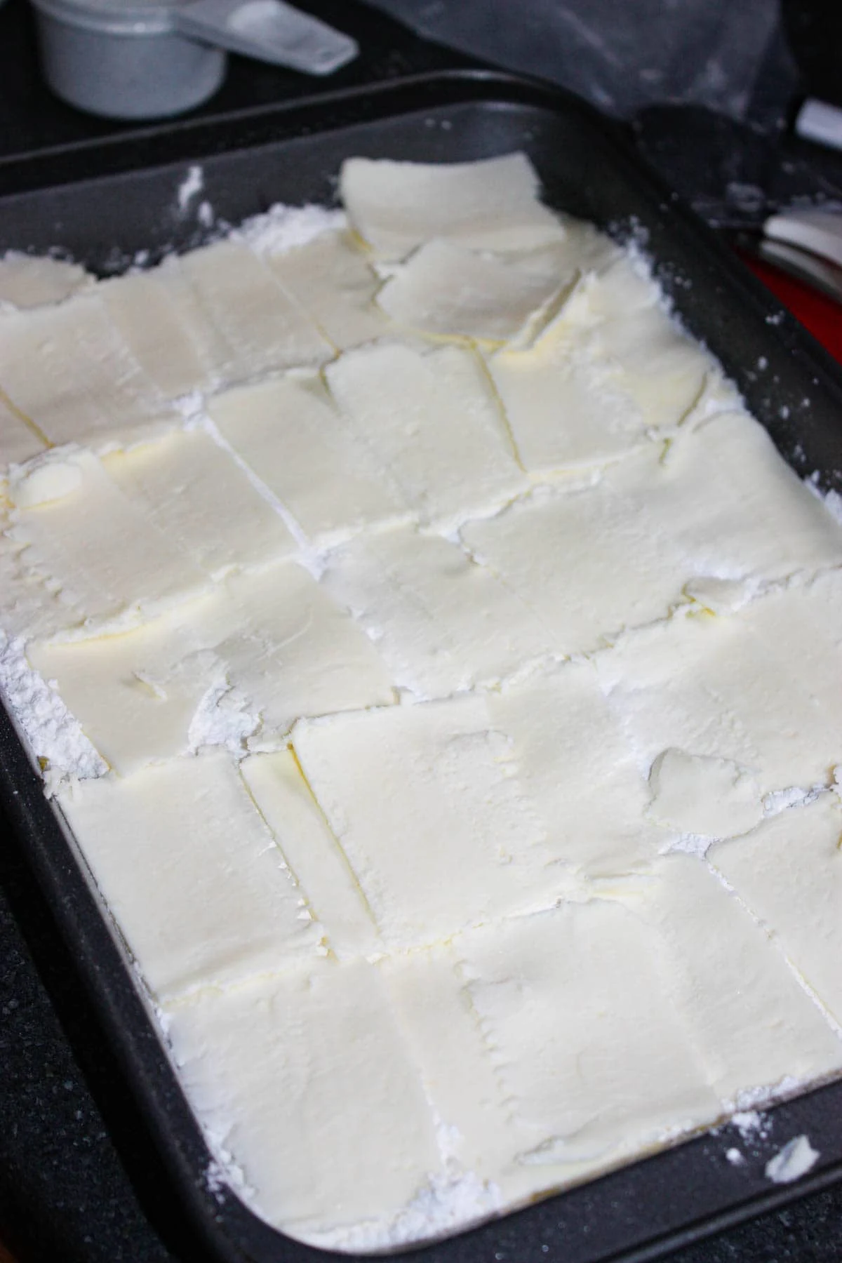 - Spread the peaches out evenly in the prepared pan and cut them into smaller pieces.
