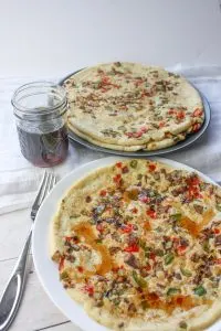 Once the toppings were in the crepe pan I ladled about 1/4 of the batter over top of them and swirled it to reach the edges of the pan.