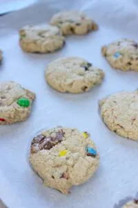 Candy cookies are a nice crunchy cookie base loaded with oatmeal, M & M candies and chewy Turtles chocolates. This gluten free dessert, or snack, is sure to be a hit in your home.