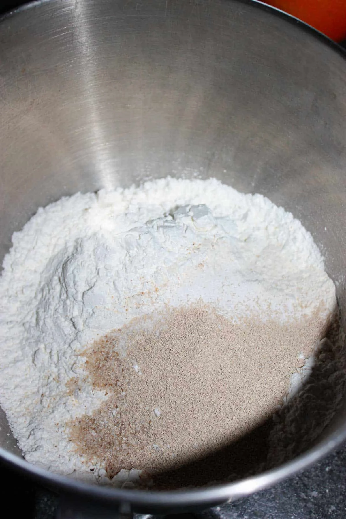- Measure the flour, granulated sugar, psyllium husk powder, xanthan gum, salt, baking powder, cream of tartar and the yeast into the mixing bowl for a stand mixer.