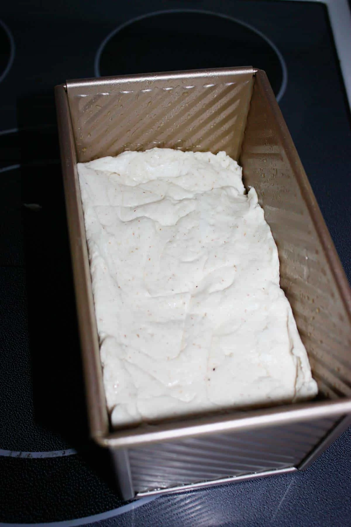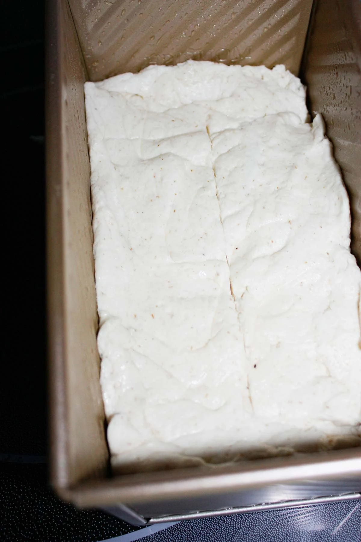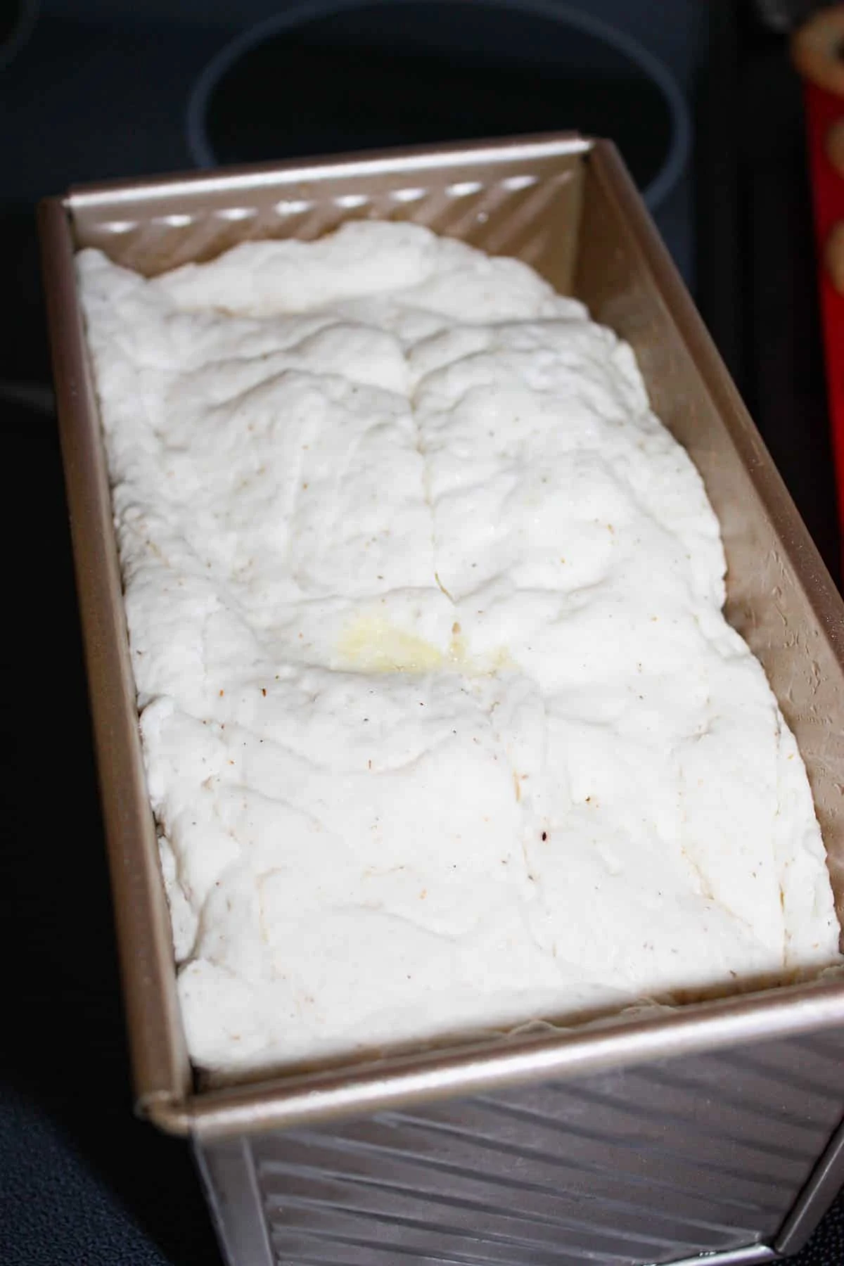 After 5 minutes I scraped the dough into the prepared loaf pan.