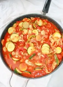 This gluten free dinner recipe is loaded with chicken and vegetables all smothered in a tomato sauce.