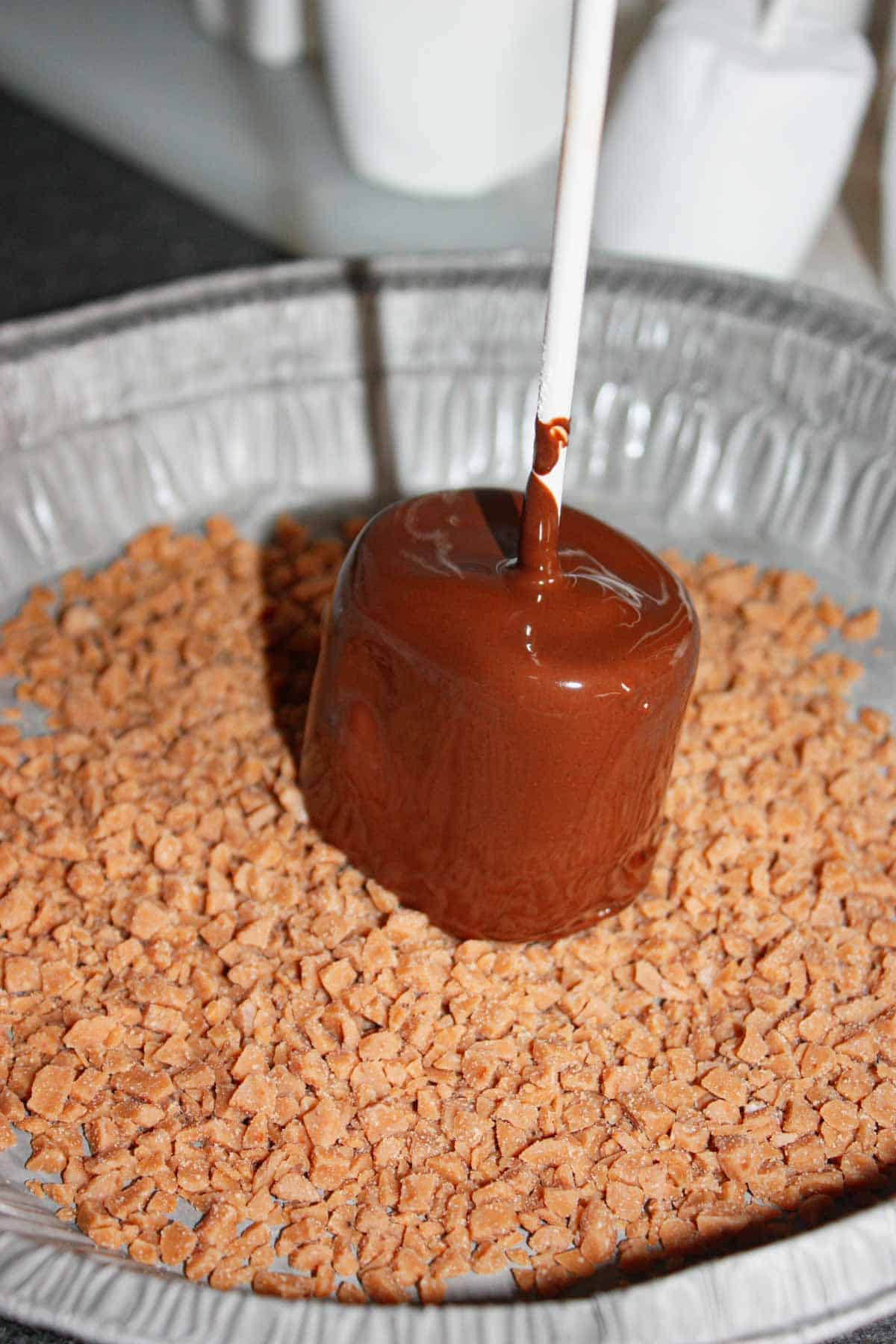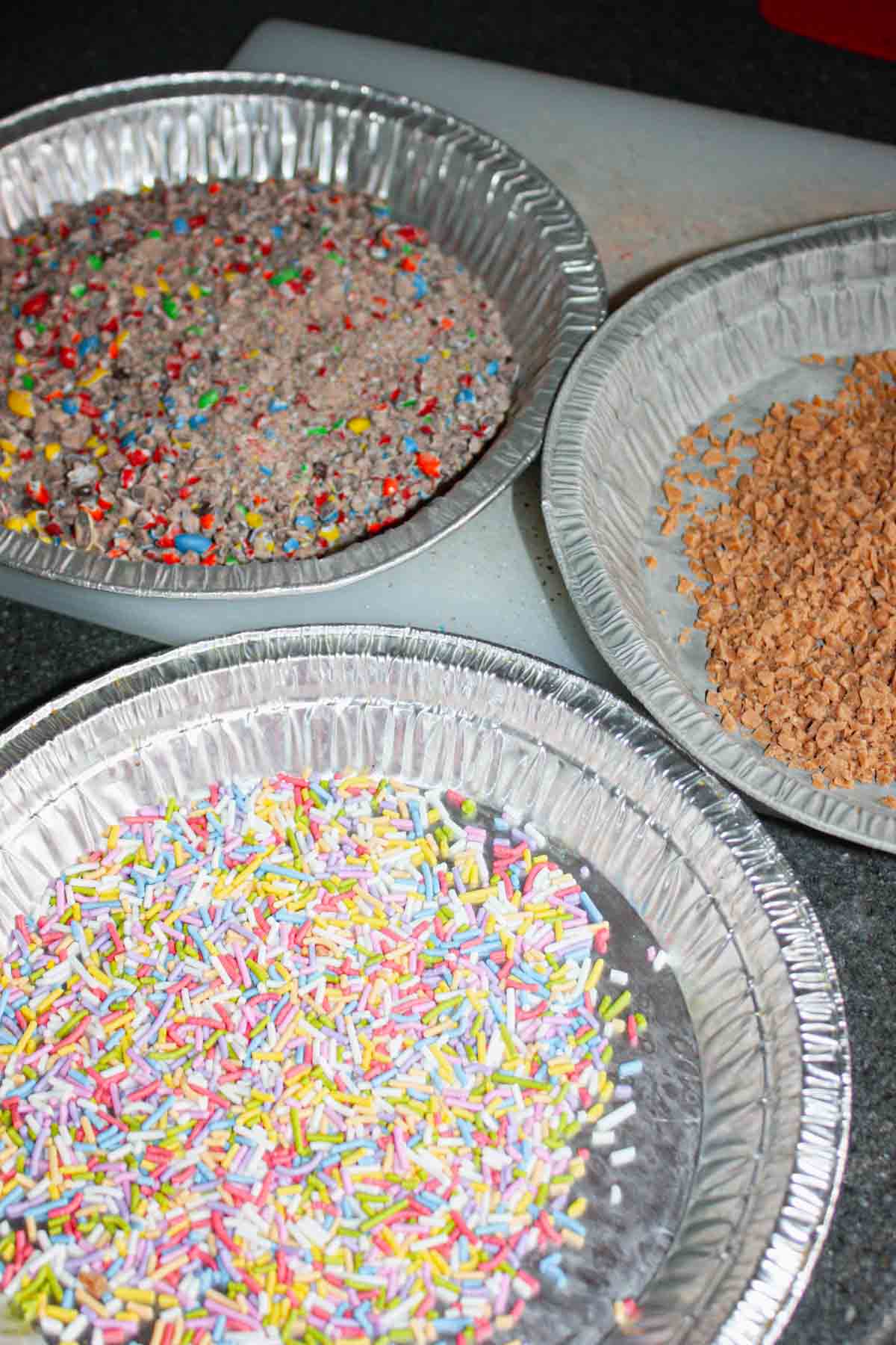 For decorating my Chocolate Covered Marshmallow Pops I put the crushed candies, some skor bits and some gluten free sprinkles into separate pie plates.