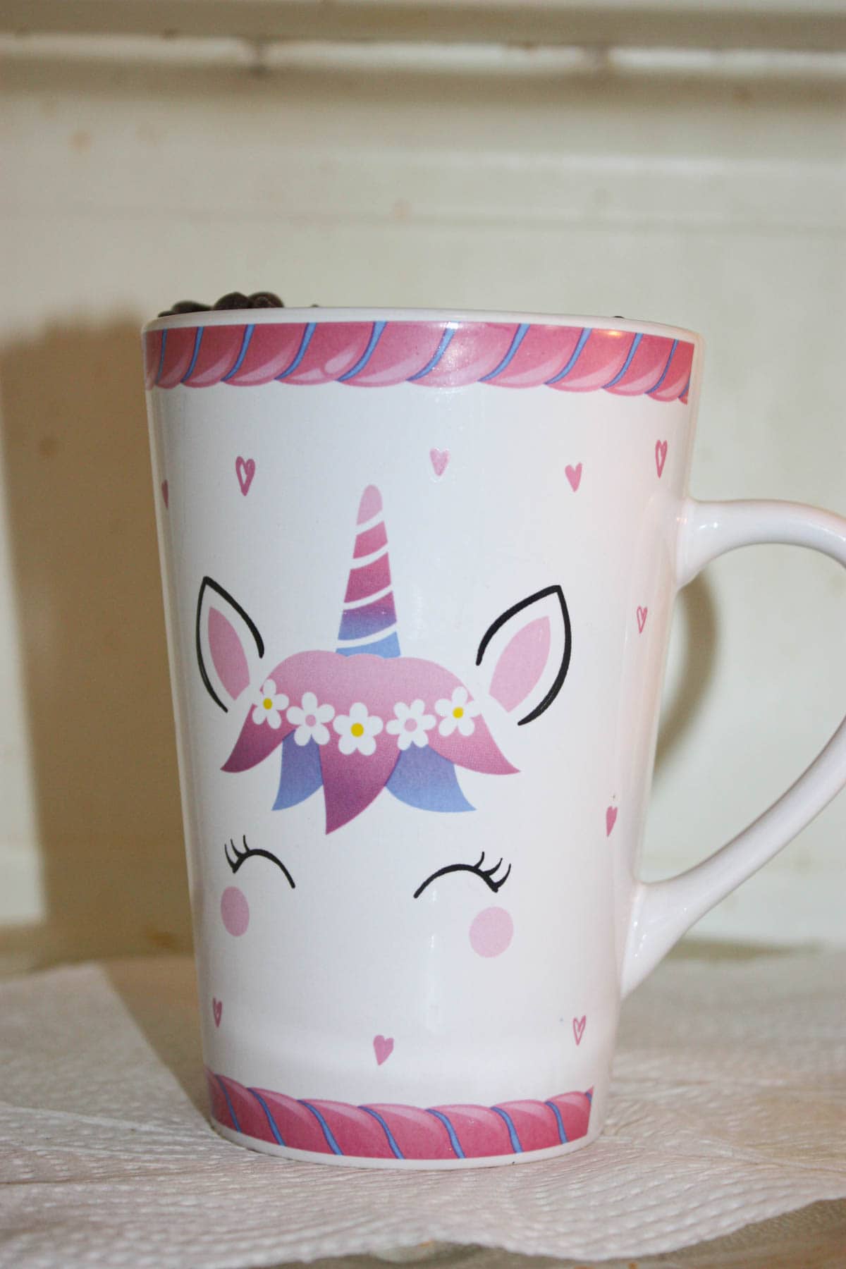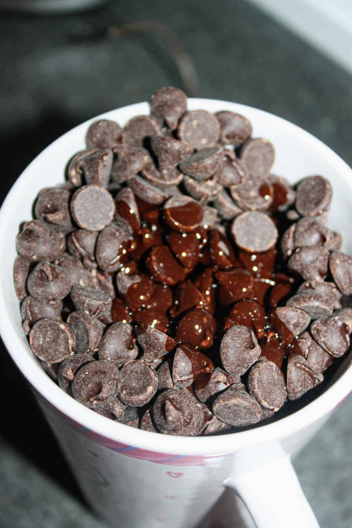 Next I placed some semi-sweet chocolate chips and milk chocolate chips in a microwaveable safe tall coffee mug.