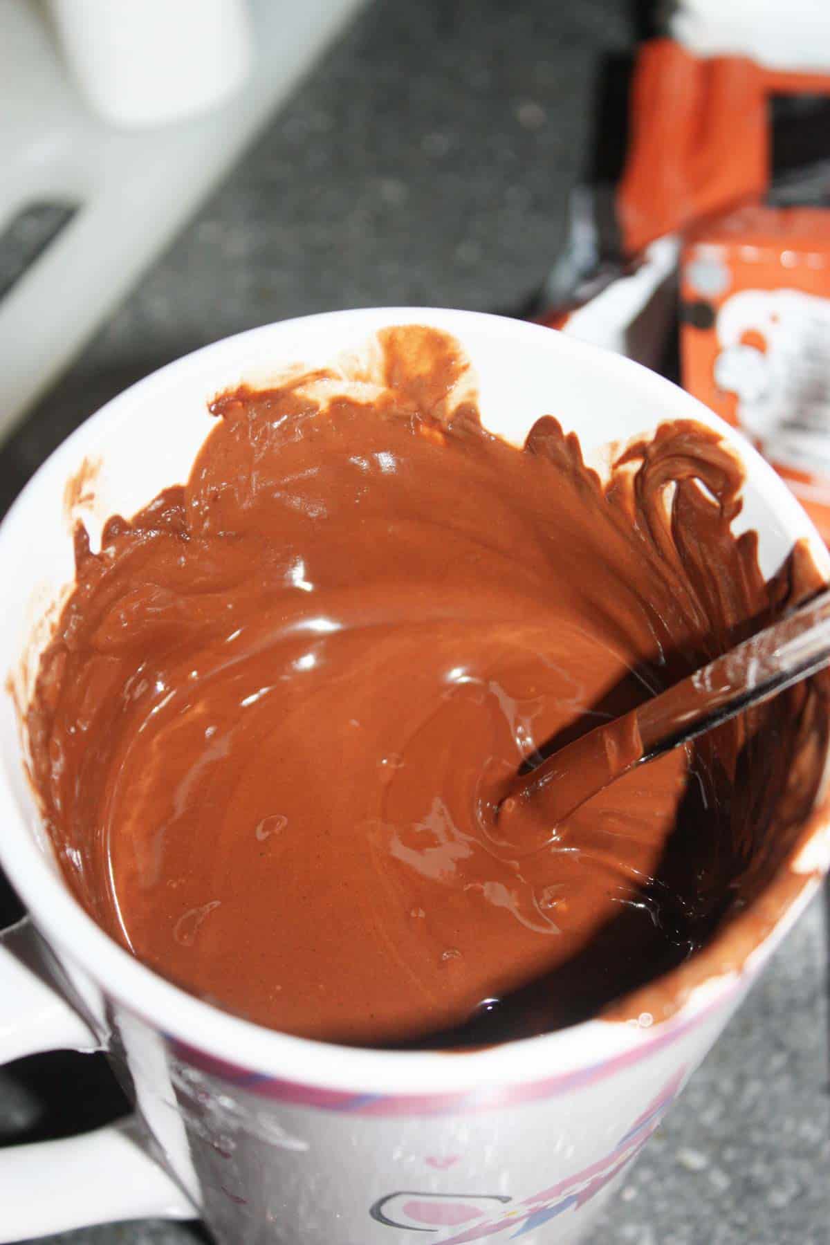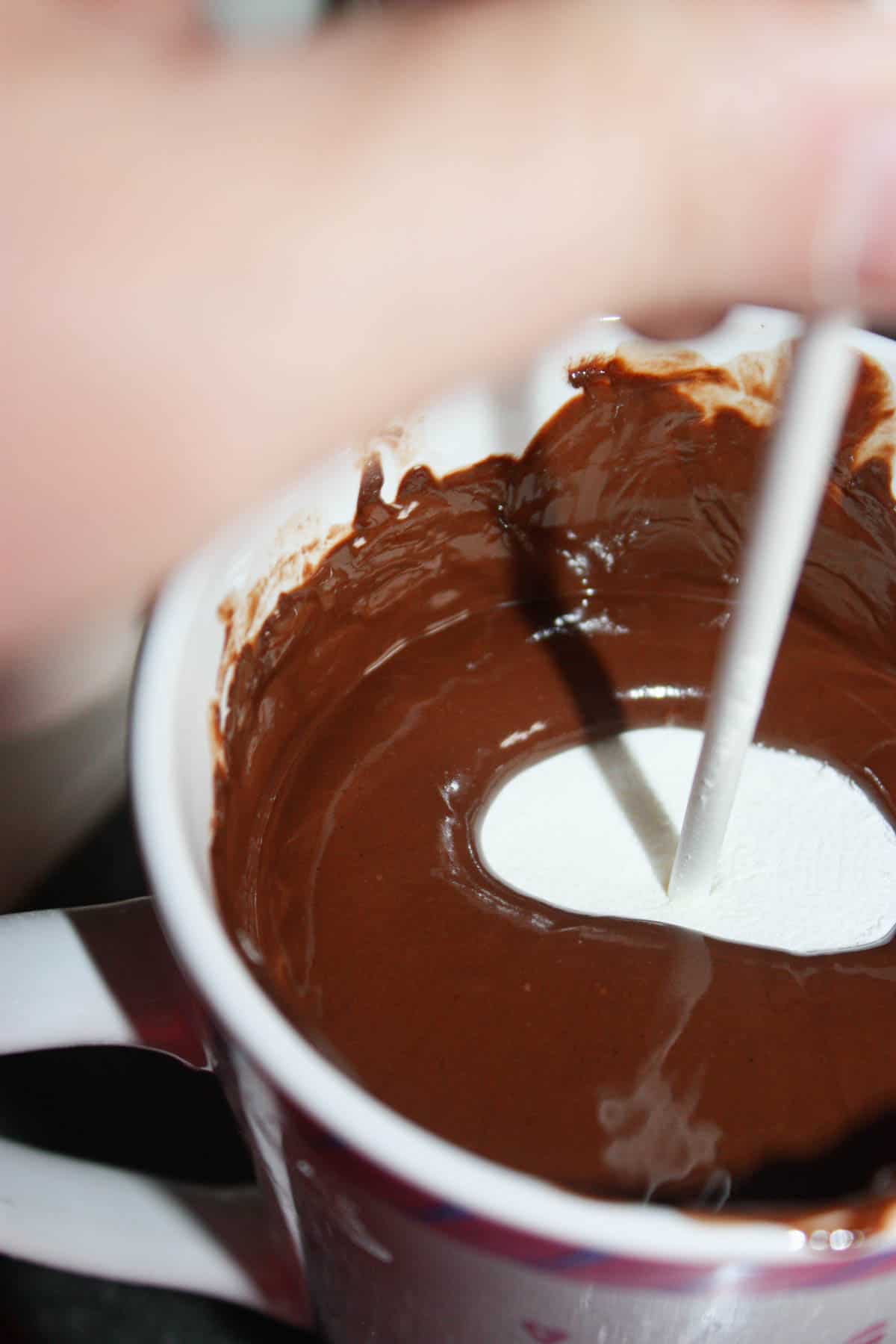 - Once chocolate has melted and been stirred until smooth, you can begin to dip the giant marshmallows. I use a large narrow coffee mug so it is easier to dip them.