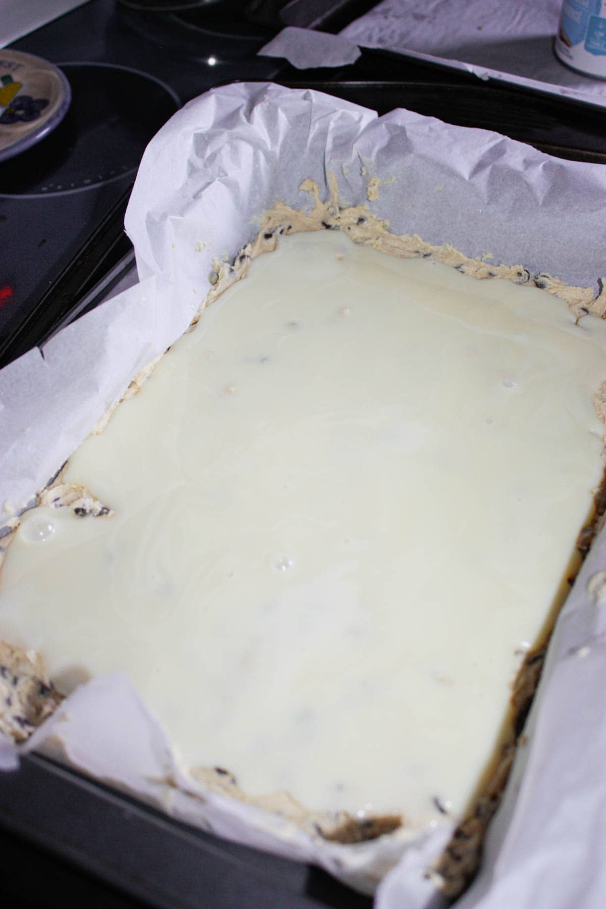 8. Pour the condensed milk over the dough staying away from the edges of the pan.