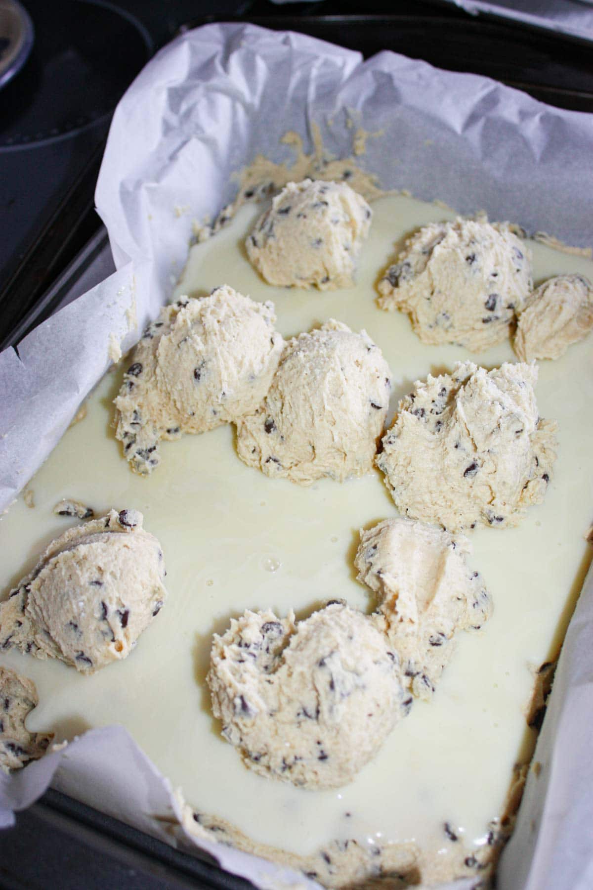 9. Scoop the rest of the dough out on top of the milk and gently press it down and out covering the whole area.