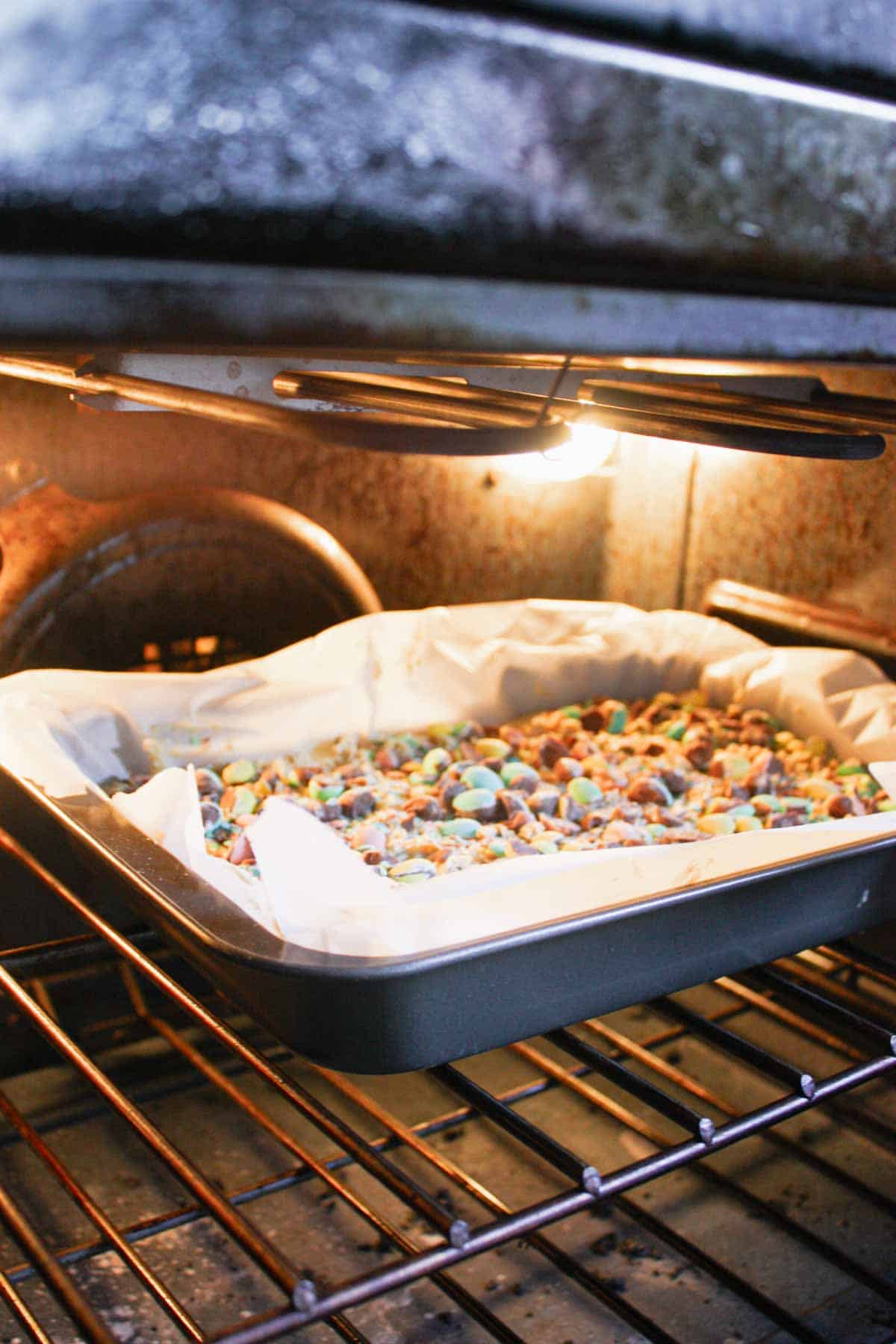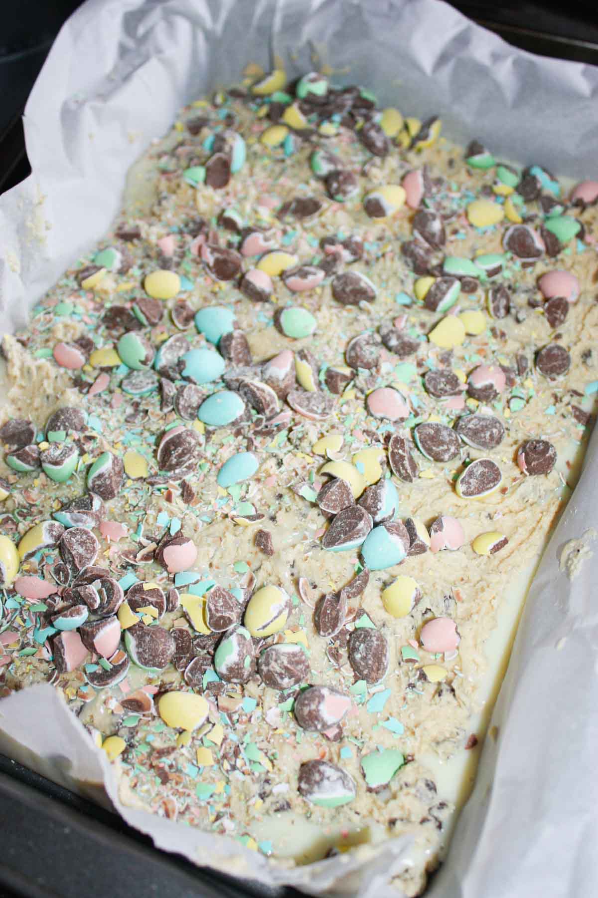 Next I sprinkled the broken mini eggs on top of the cookie dough in the baking pan.