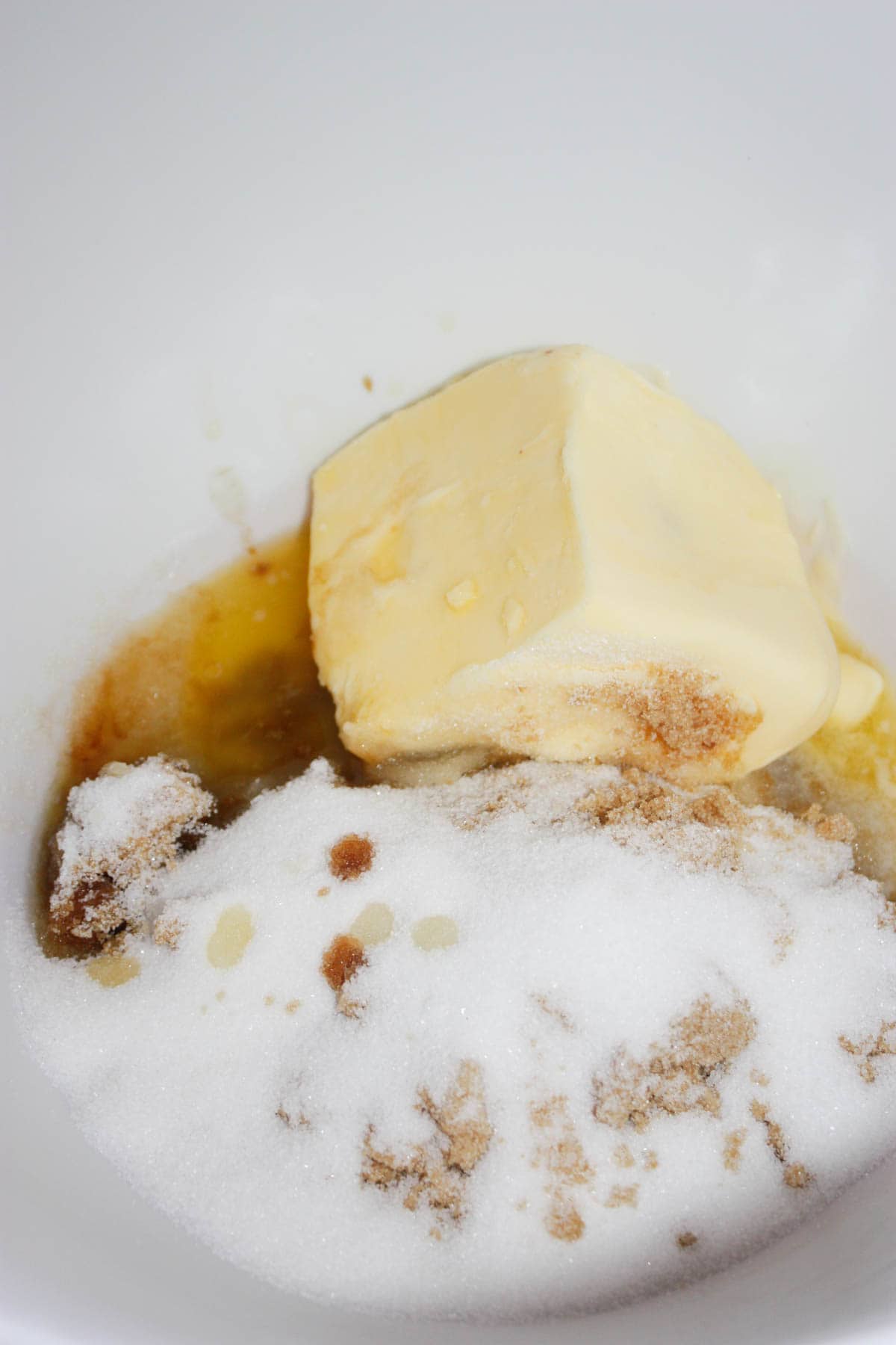 Then I dumped the softened butter into a mixing bowl with some brown sugar, granulated sugar and vanilla extract.  I used an electric hand mixer to mix them together well.