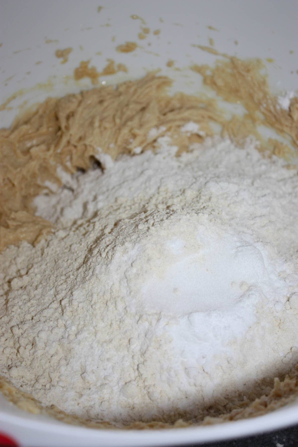 5. Measure in the two gluten free flours, baking powder, baking soda and salt.  Use electric hand mixer to combine.