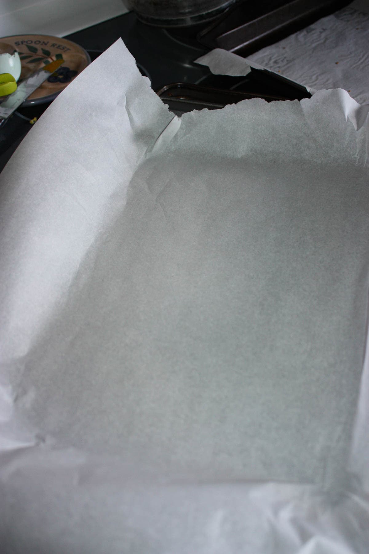 Then I lined a 9″ x 13″  baking pan with parchment paper.
