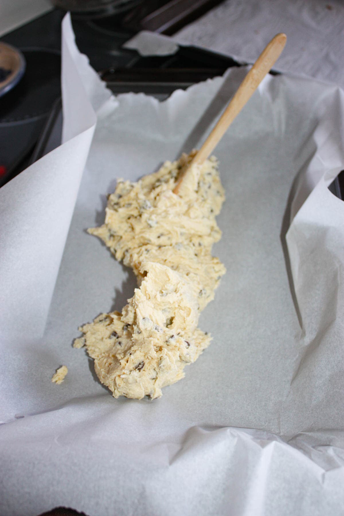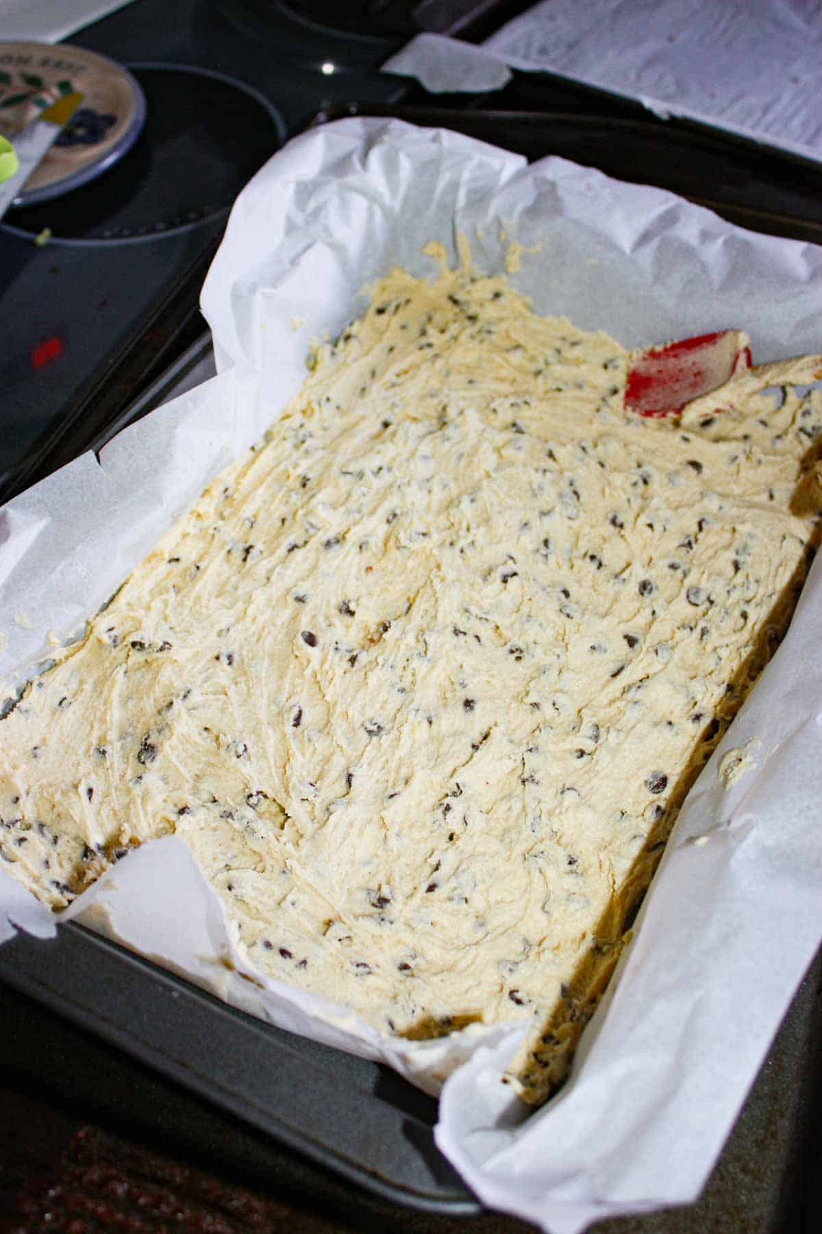 I transferred half of the cookie dough to the prepared pan.