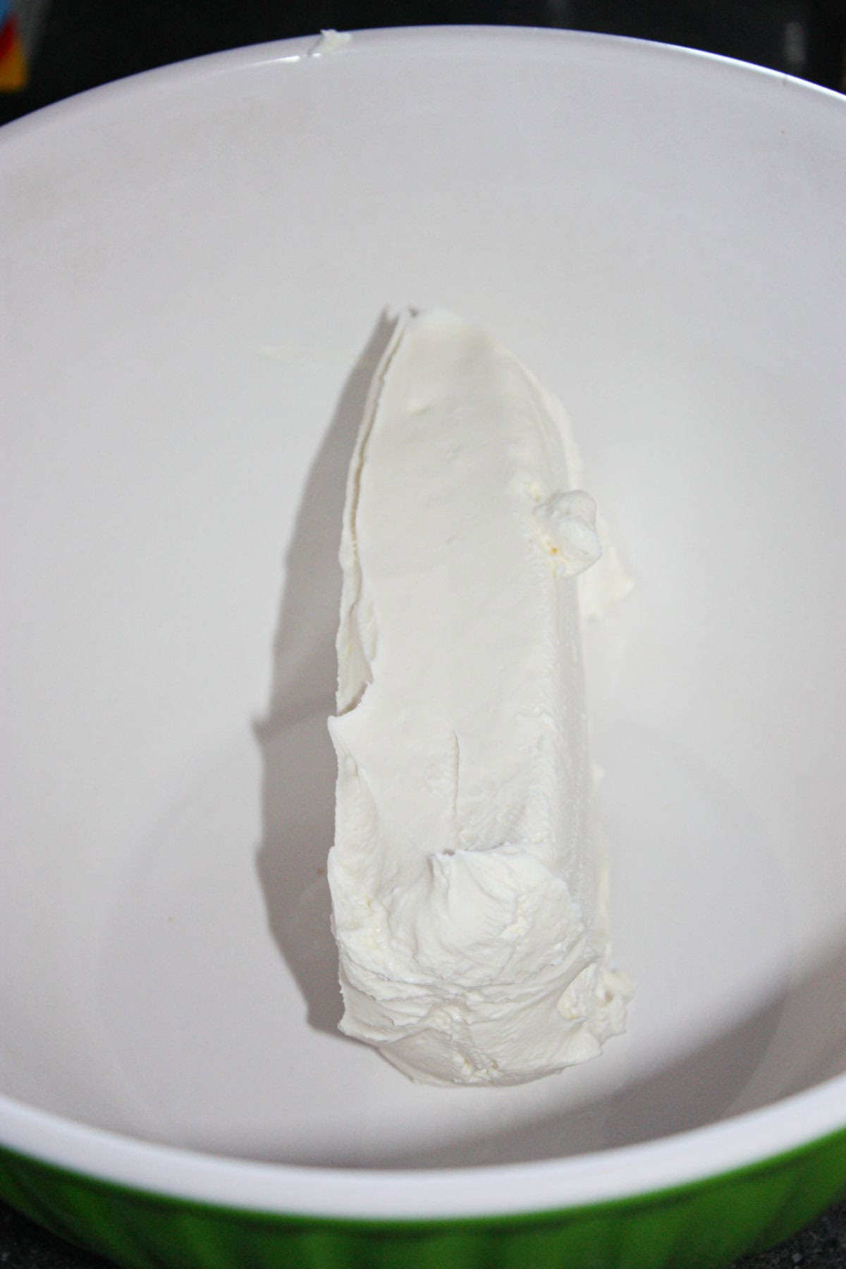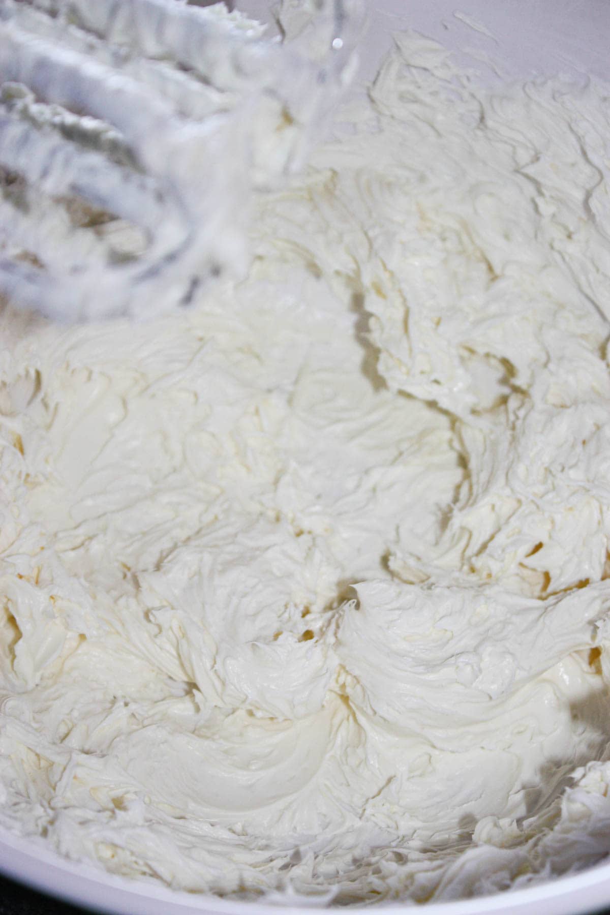 - Beat the softened cream cheese with an electric hand mixer until fluffy.