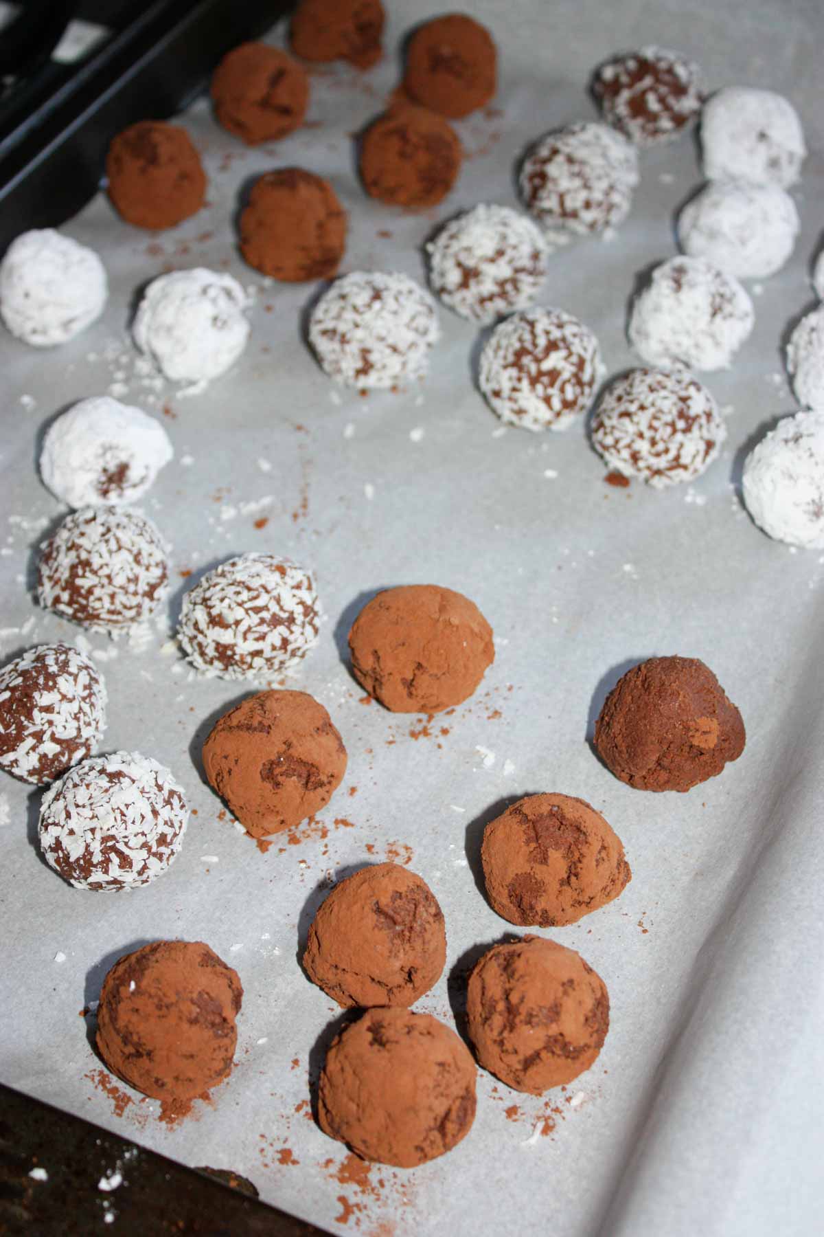 - Roll balls into your preferred toppings. I used coconut, cocoa and icing sugar.