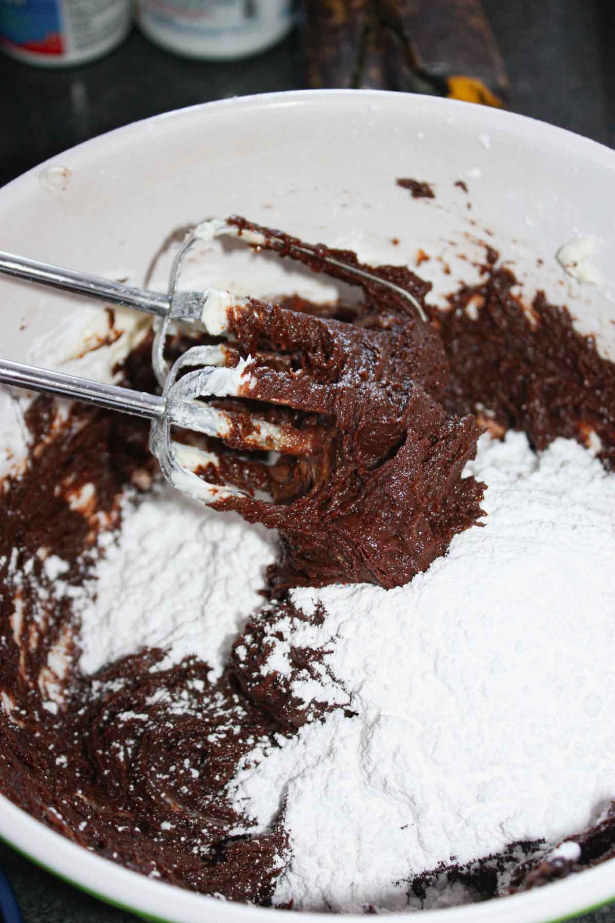 - Add 1/2 of the icing sugar and beat with the electric hand mixer.