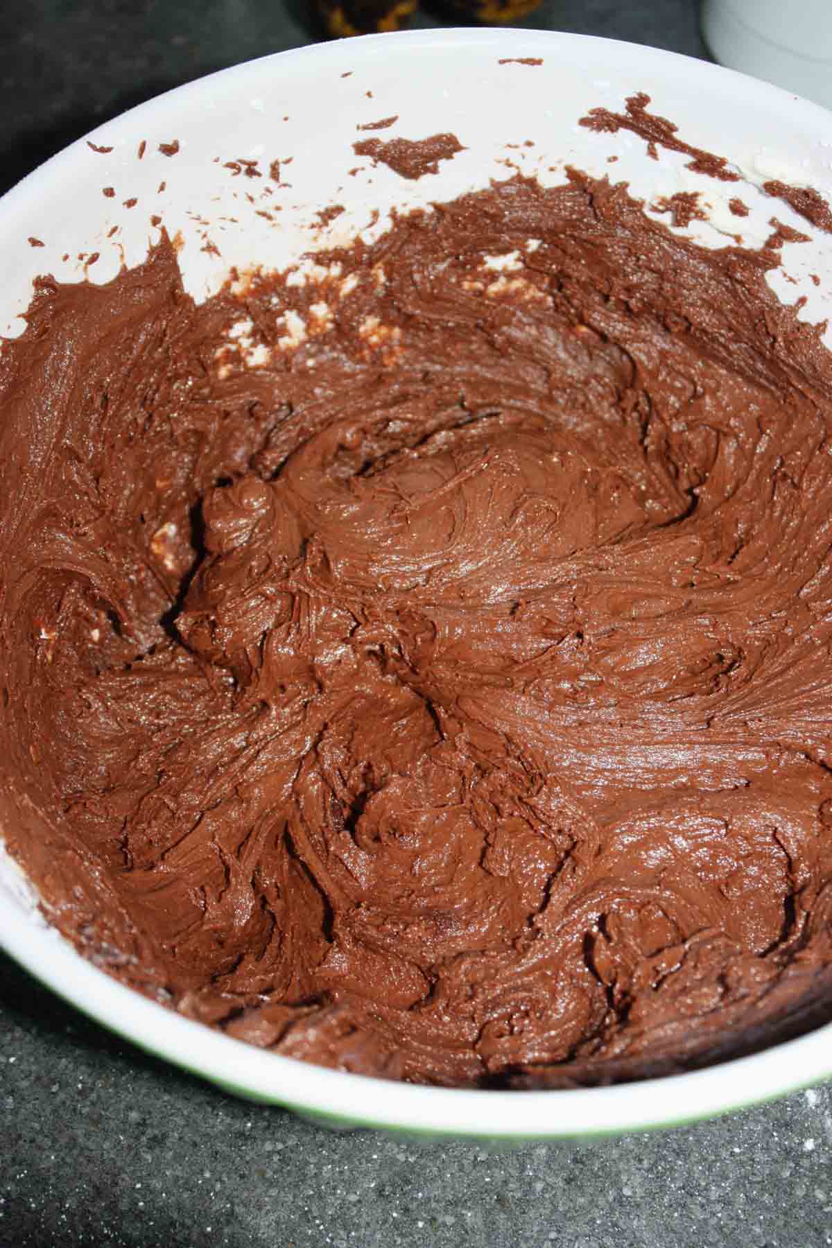 Then I poured the melted chocolate into the bowl with the whipped cream cheese.
