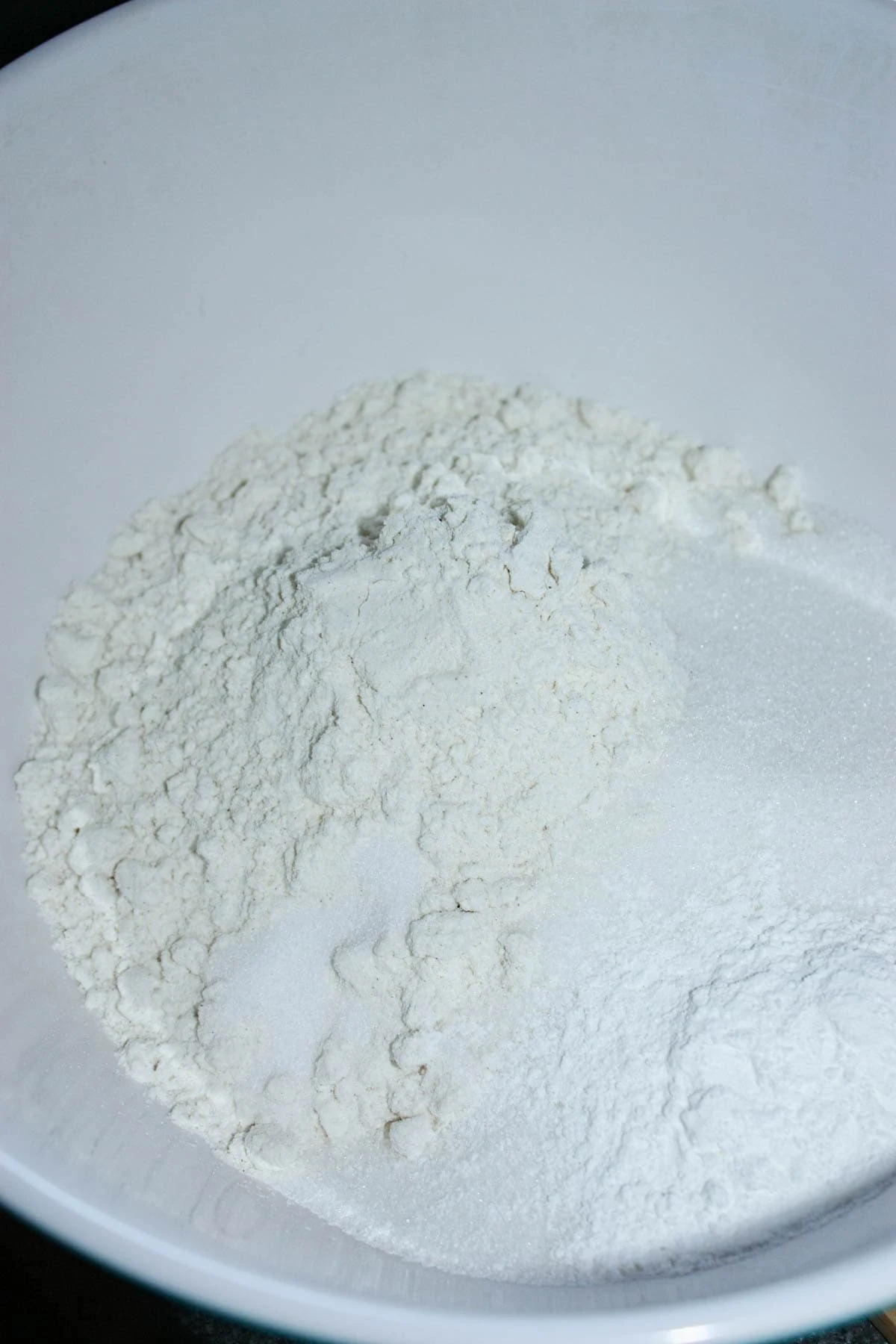 - Dump the Bob’s Red Mill 1 to 1 Gluten Free Baking Flour, granulated sugar, baking powder and salt into a large mixing bowl and combine.