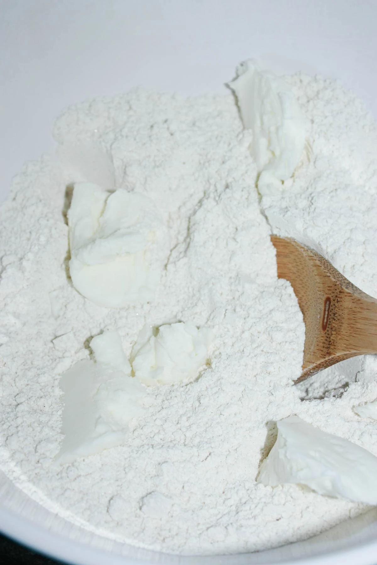 - Add the butter to the dry ingredients and cut in until well incorporated.