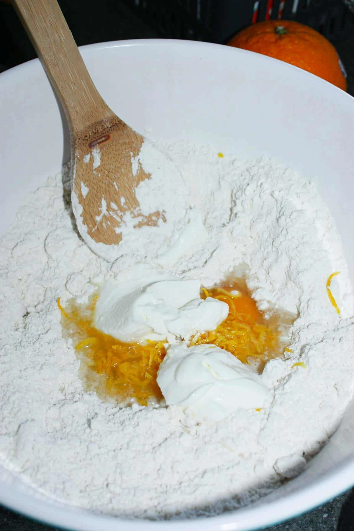 - Make a well in center of combined ingredients and add the large eggs, the first amount of lemon juice, lemon zest, plain yogurt and almond milk. Stir to combine.