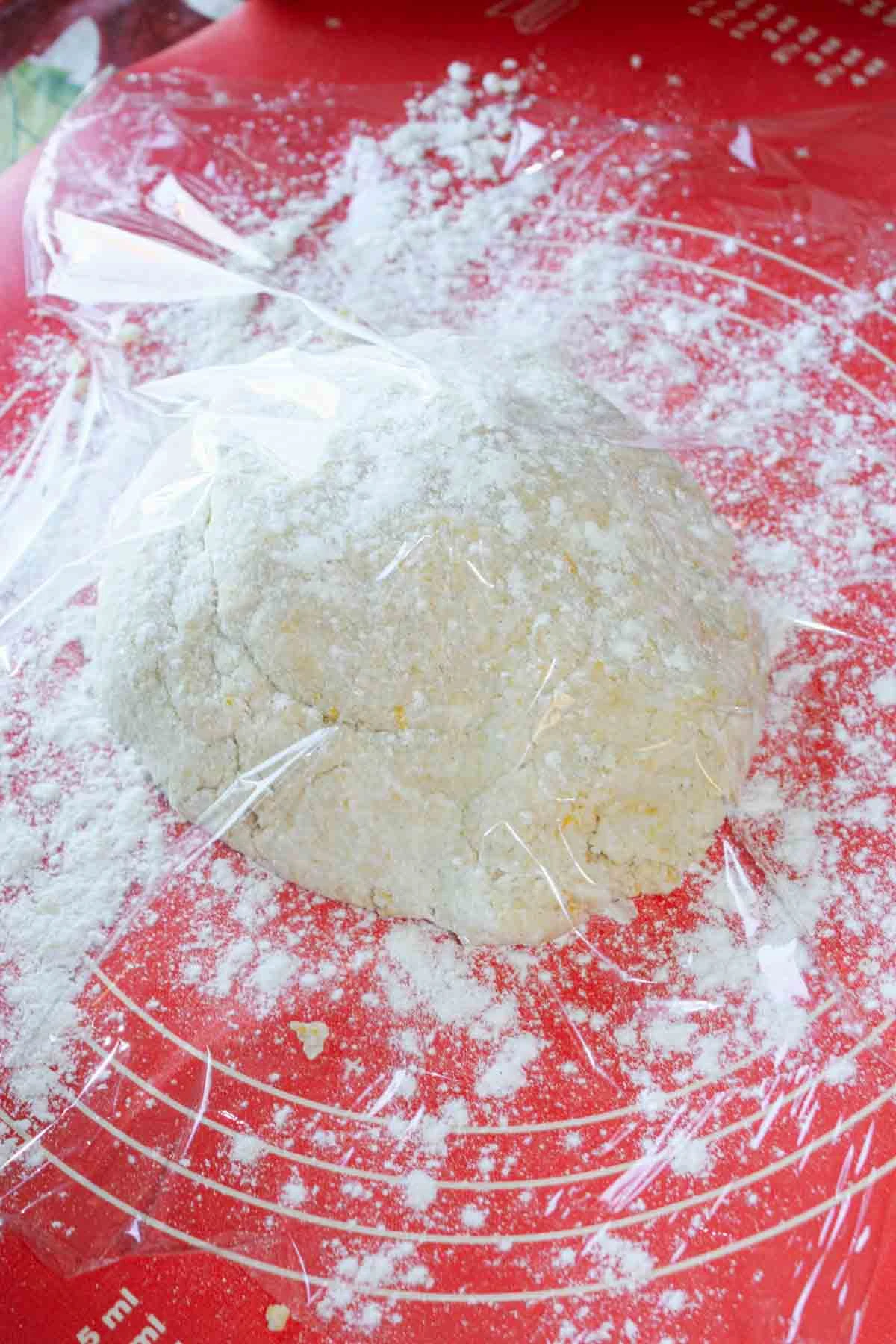 - Dump the batter out onto the pastry sheet, sprinkle with flour and cover with plastic wrap to roll out to about 3/4″ to 1″ thickness.