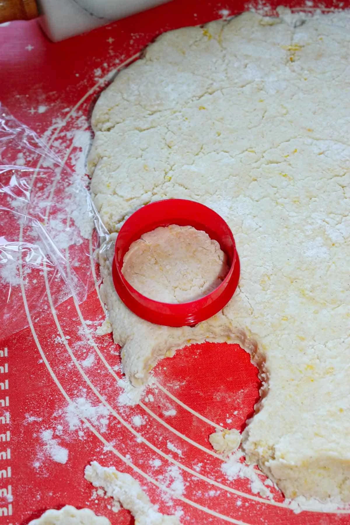 - Use a cookie cutter, I chose a 2″ round one, to cut the scones from the dough.