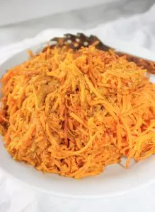 Hot Sweet Potato Slaw adds a burst of colour to any table. It provides a nice light side because it is shredded.