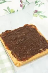 13. Spread the melted chocolate over top of the fudge in the pan.