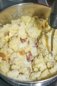 - Use a potato masher and begin mashing the pototoes. Add remaining almond milk 1/4 cup at a time until you get your desired consistency.