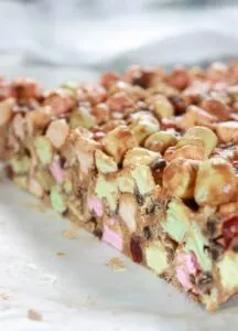 Each square is packed with colourful marshmallows, crispy cereal, fruit and chocolate.