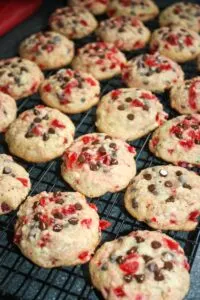 Chunks of maraschino cherries and mini chocolate chips enhance the flavour of these tasty cookies.