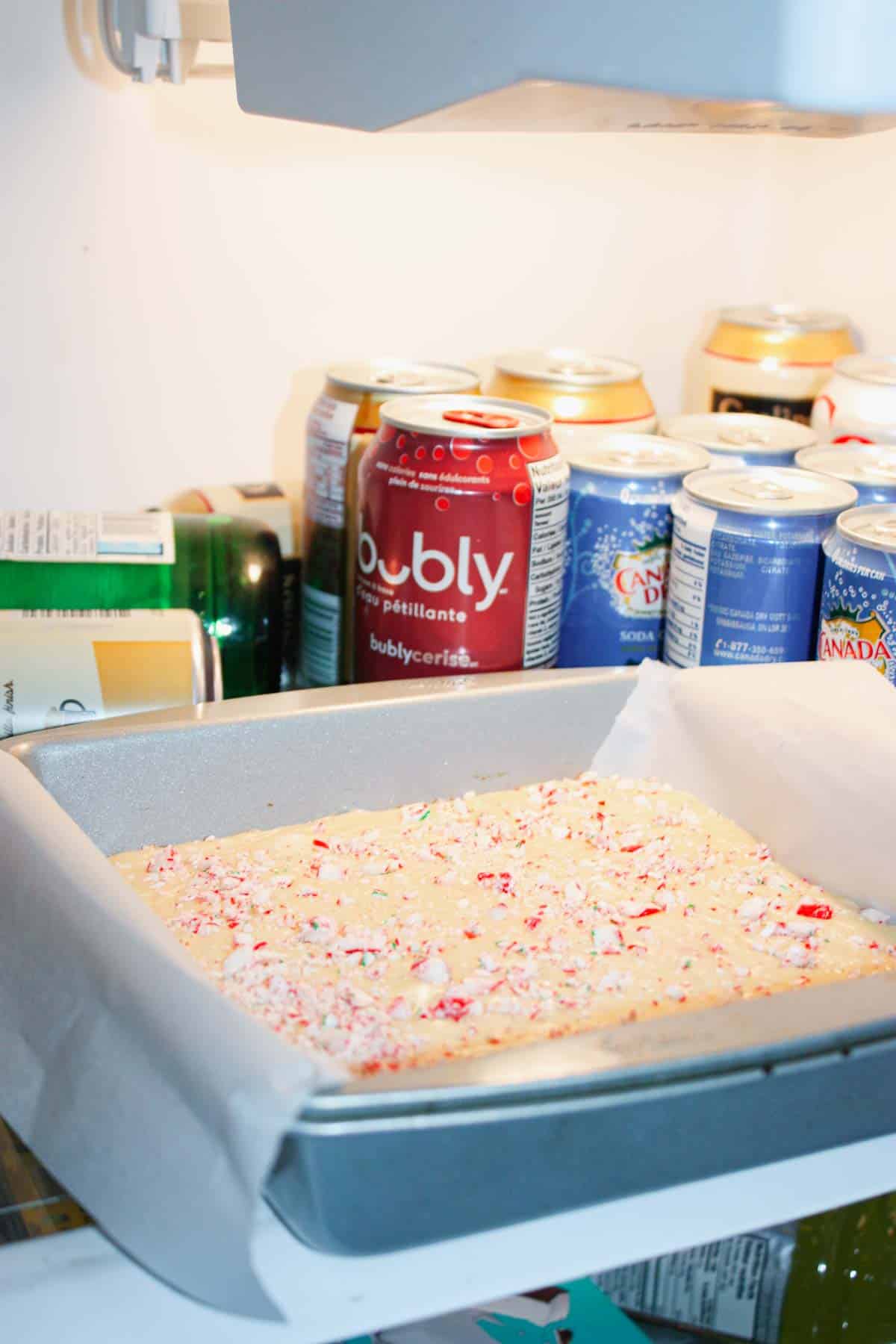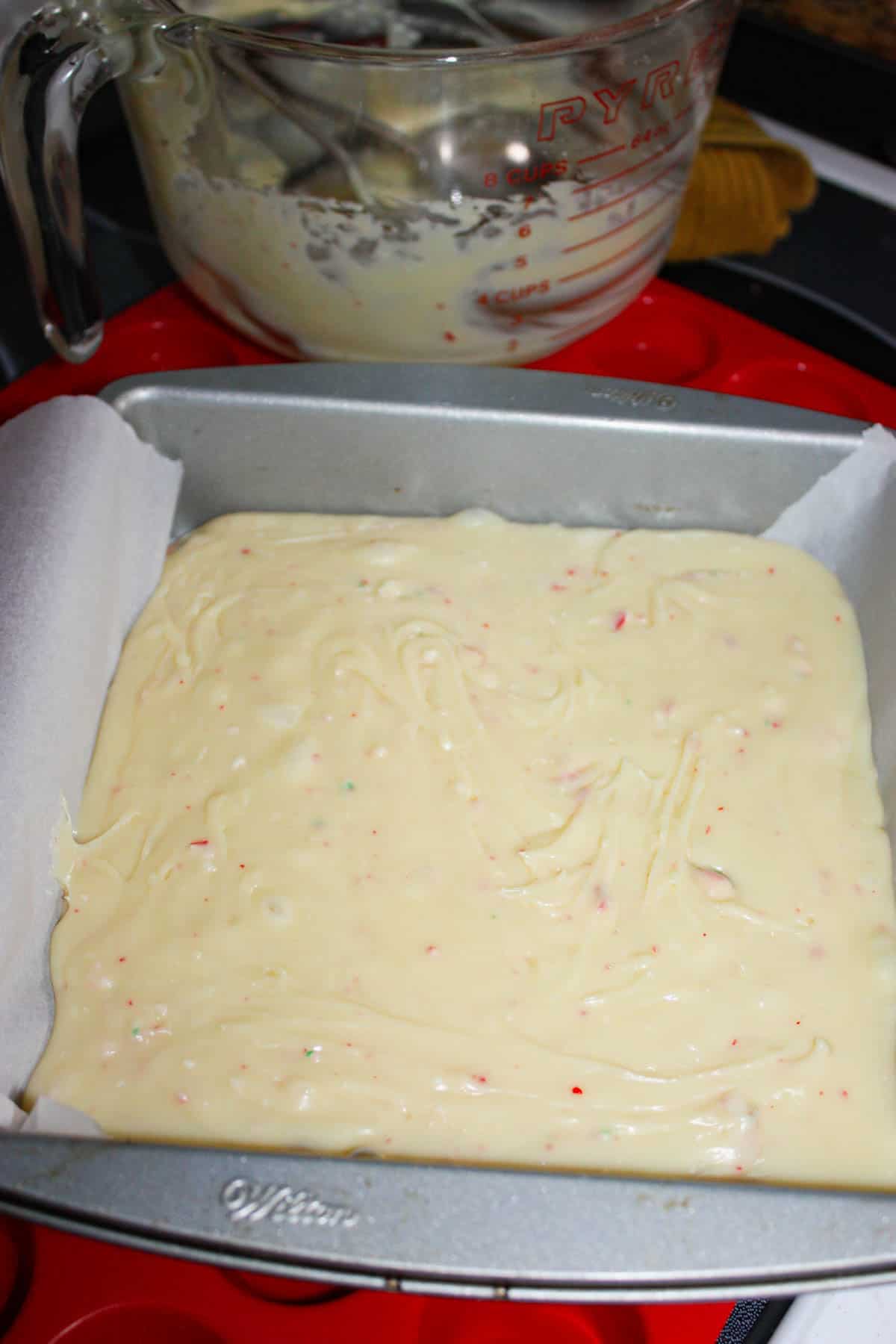 10. Sprinkle the crushed 2 tbsp of candy canes on top of the fudge.