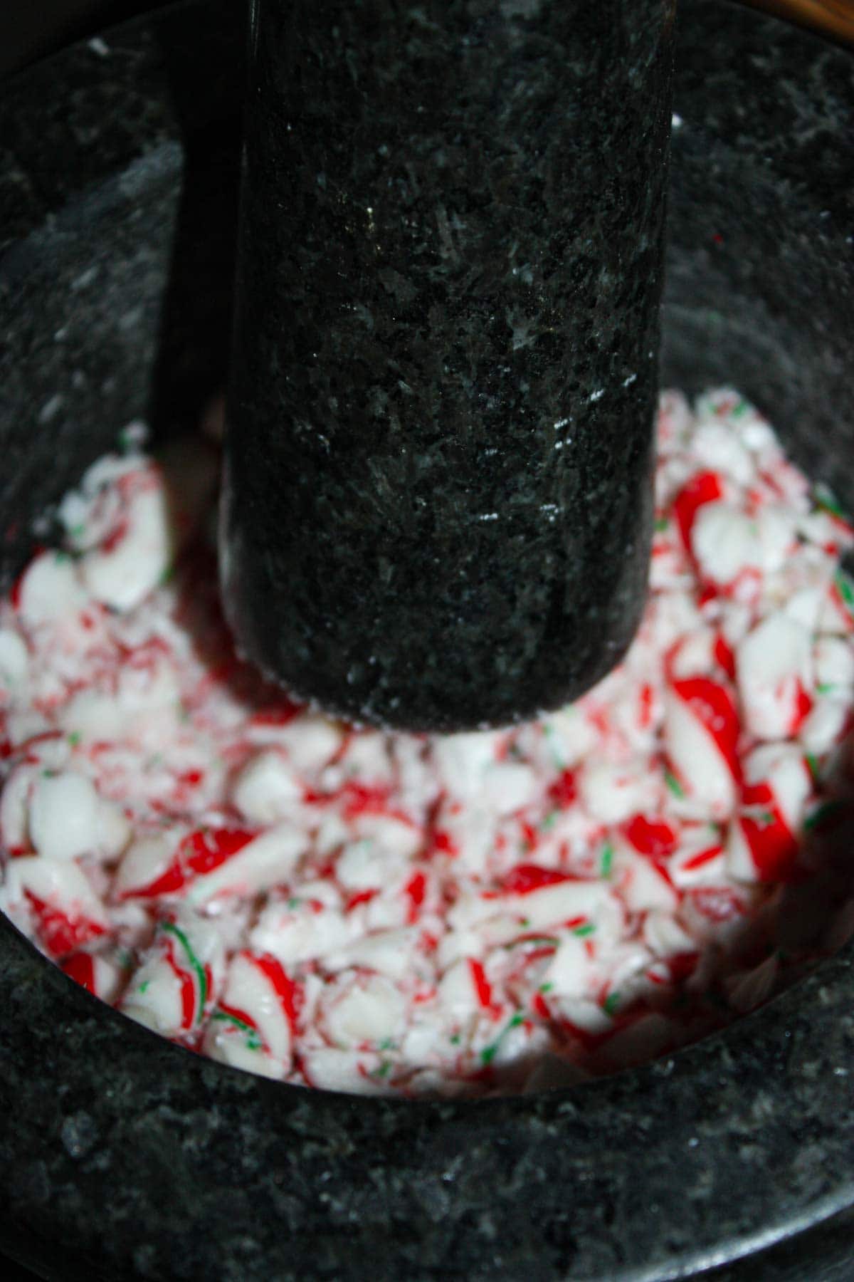 5. While chocolate melting crush up some gluten free candy canes.  Reserve 2 tbsp.
