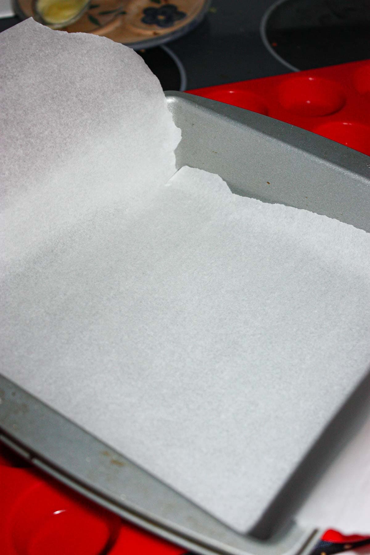 1. Line an 8 x 8 inch baking pan with a parchment paper sling.