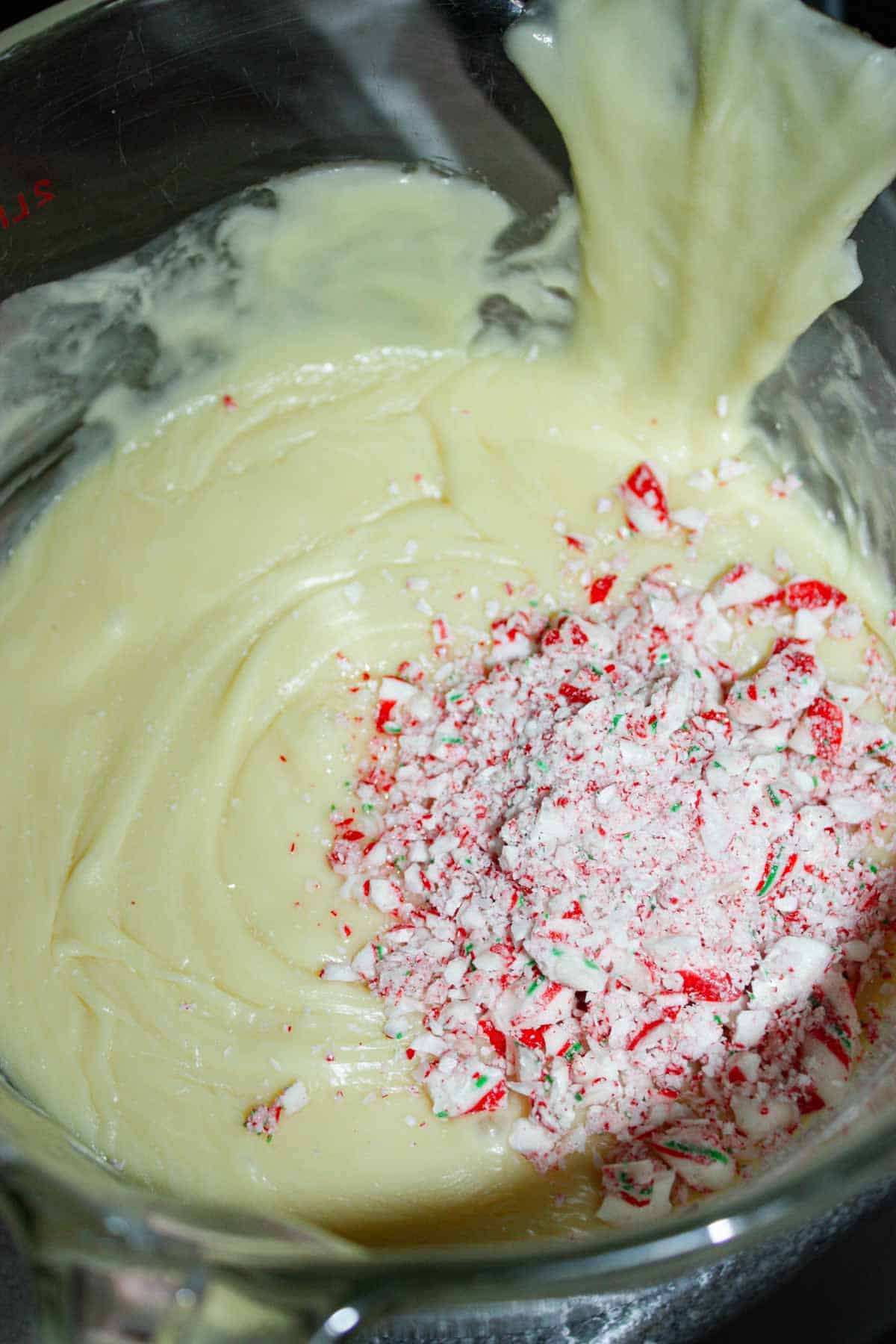 8. Stir in the peppermint extract, salt and most of the crushed candy canes.