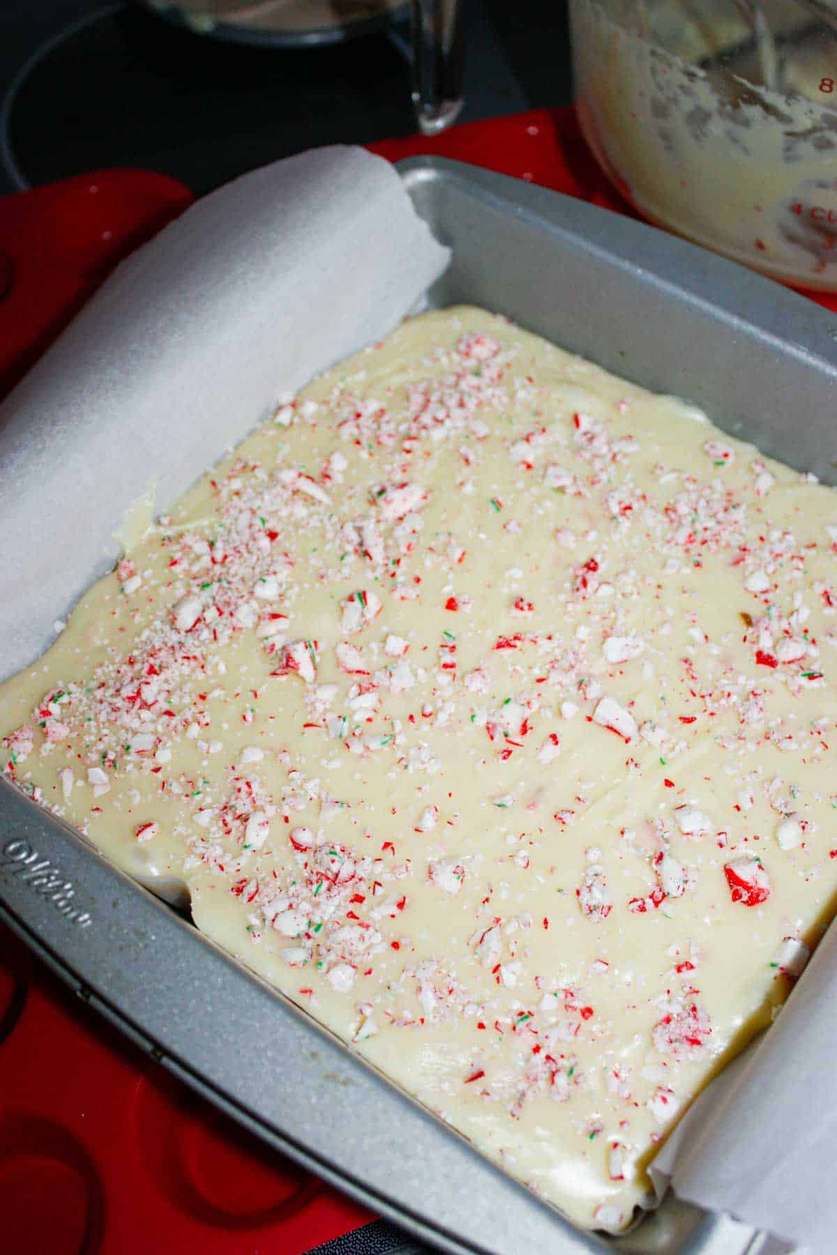 Crushed candy canes add sparkle, color, and a satisfying crunch to every creamy square.