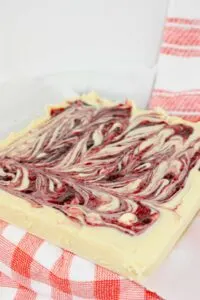 Using a knife I pulled the raspberry jam through the fudge repeatedly until only a bit remained on the top.