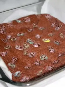 The final step was to evenly spread some mini easter eggs on top of the brownie batter.