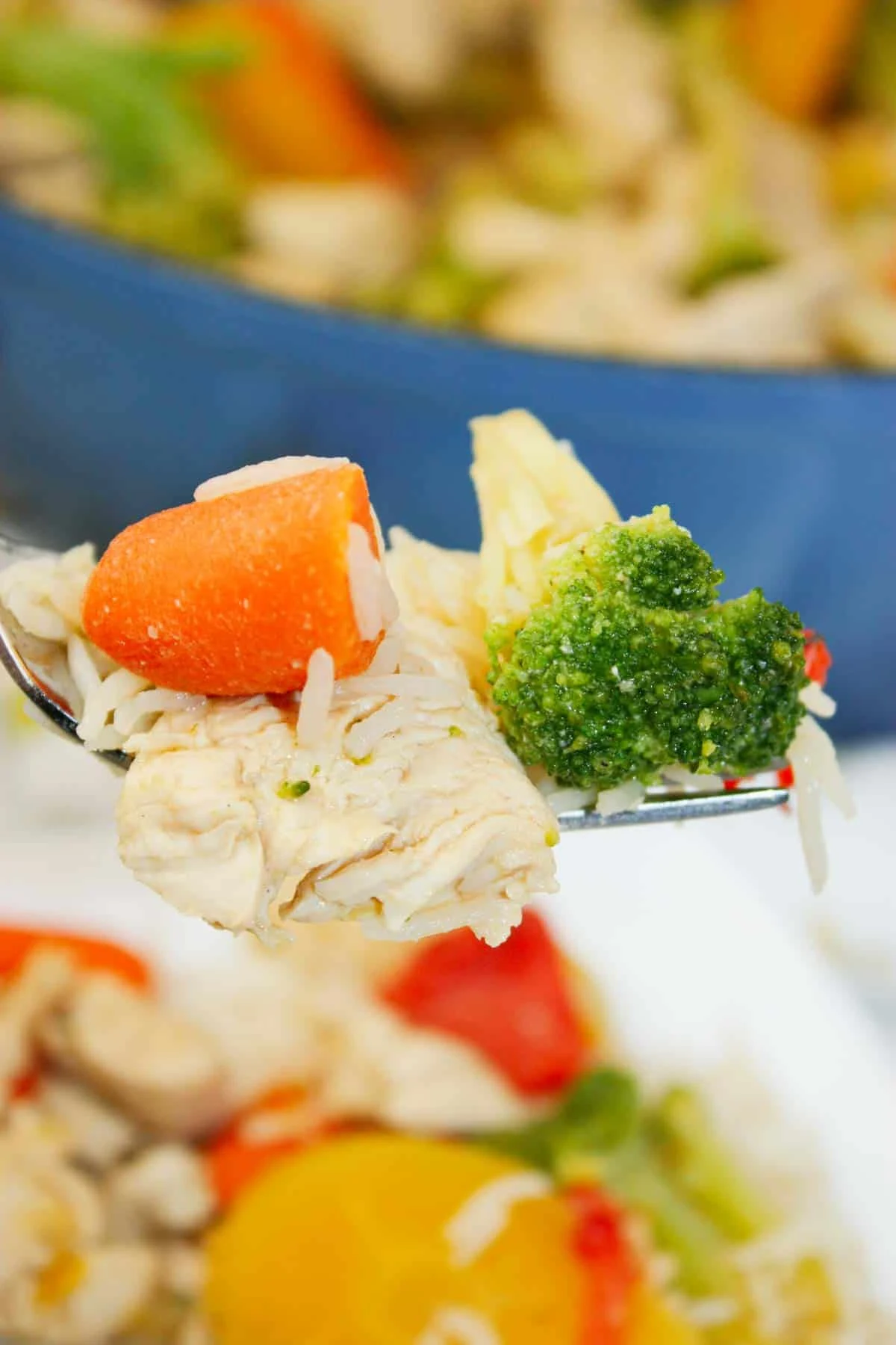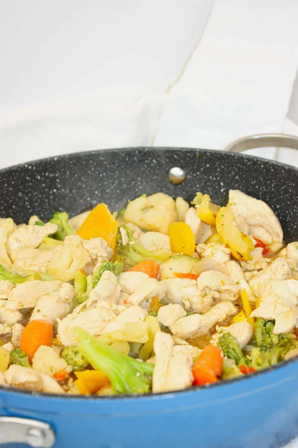 I continued cooking for about 10 minutes or until the chicken was cooked through and the vegetables were tender crisp.
