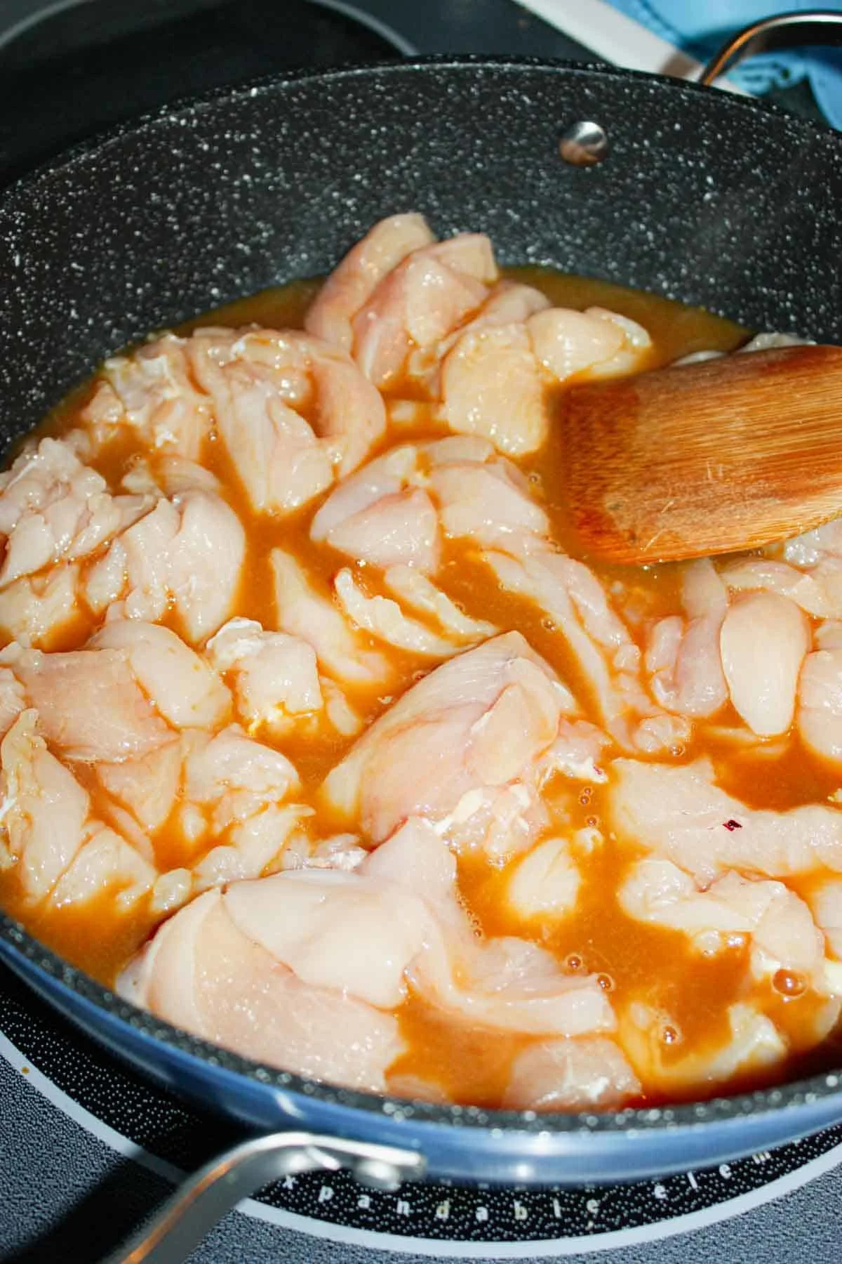 4. Once combined add the chicken strips and cook for about 2 minutes, stirring often.