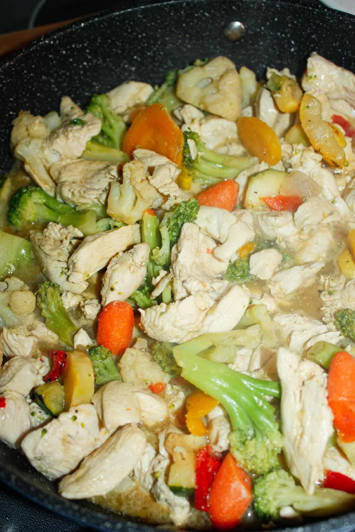 6. Continue cooking for about 10 minutes or until the chicken is cooked through and your vegetables are tender crisp.  Stir often.