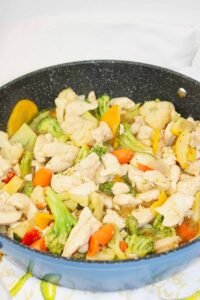 6. Continue cooking for about 10 minutes or until the chicken is cooked through and your vegetables are tender crisp.  Stir often.