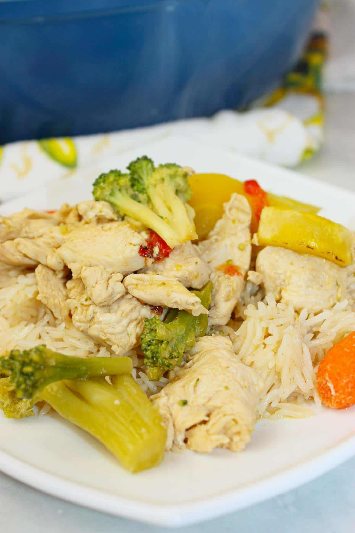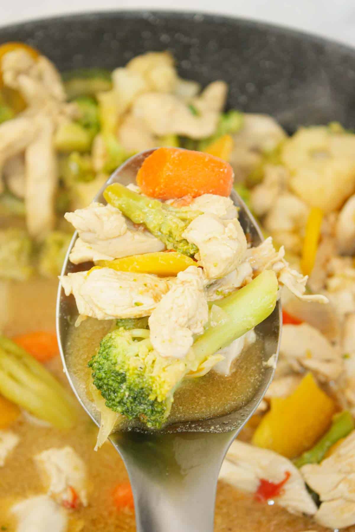 I continued cooking for about 10 minutes or until the chicken was cooked through and the vegetables were tender crisp.