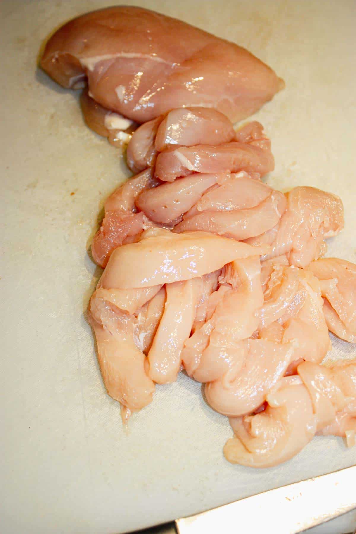 The first step to preparing Orange Chicken Stir Fry was to slice up some boneless, skinless chicken breasts and turning a large skillet to medium high heat.