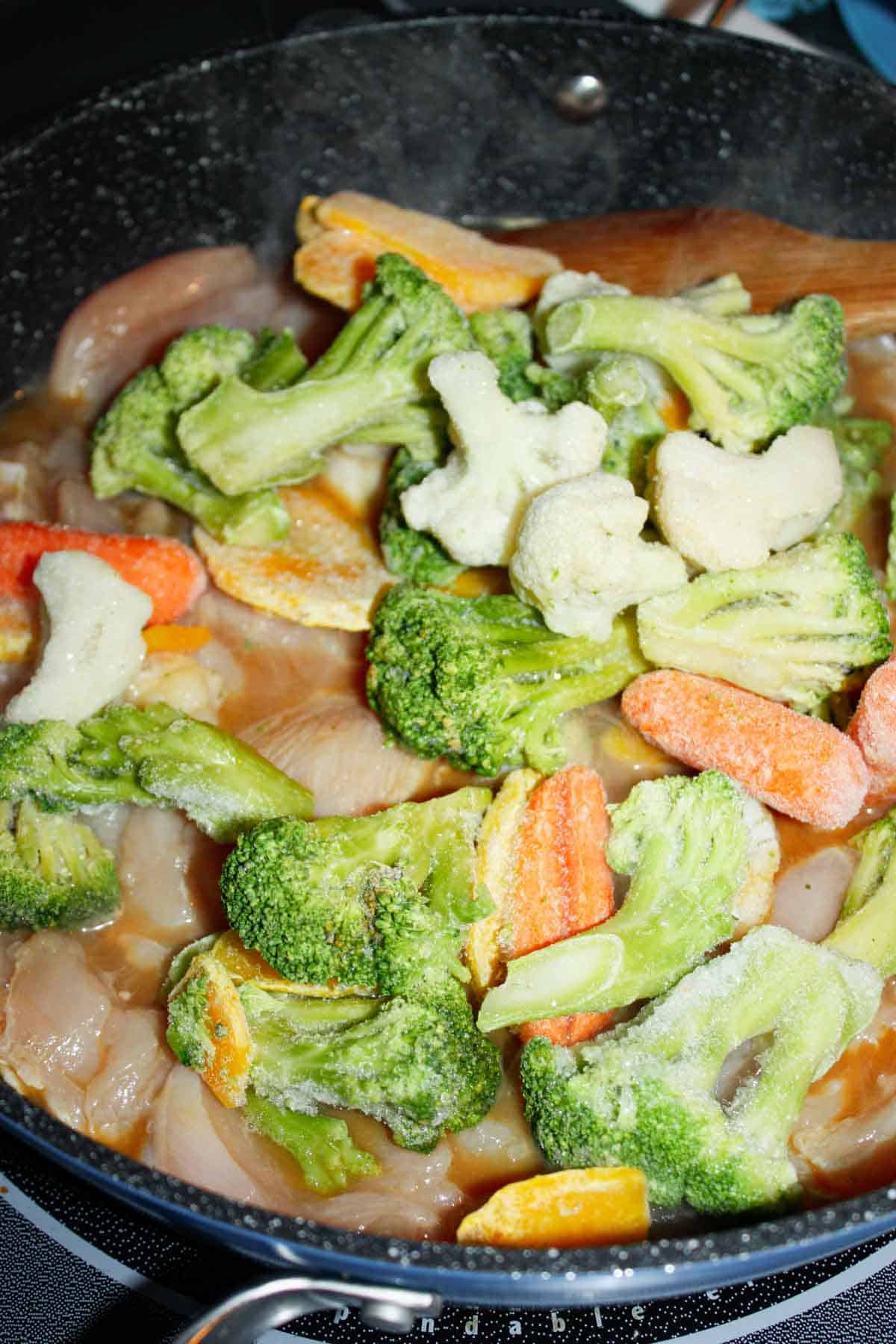 5. Dump in the mixed frozen vegetables you have chosen and stir to combine.