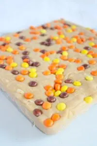 Then I pressed some mini Reese’s Pieces down into the fudge.