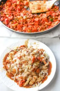Then I poured a jar of pizza sauce on top of the ingredients in the skillet.